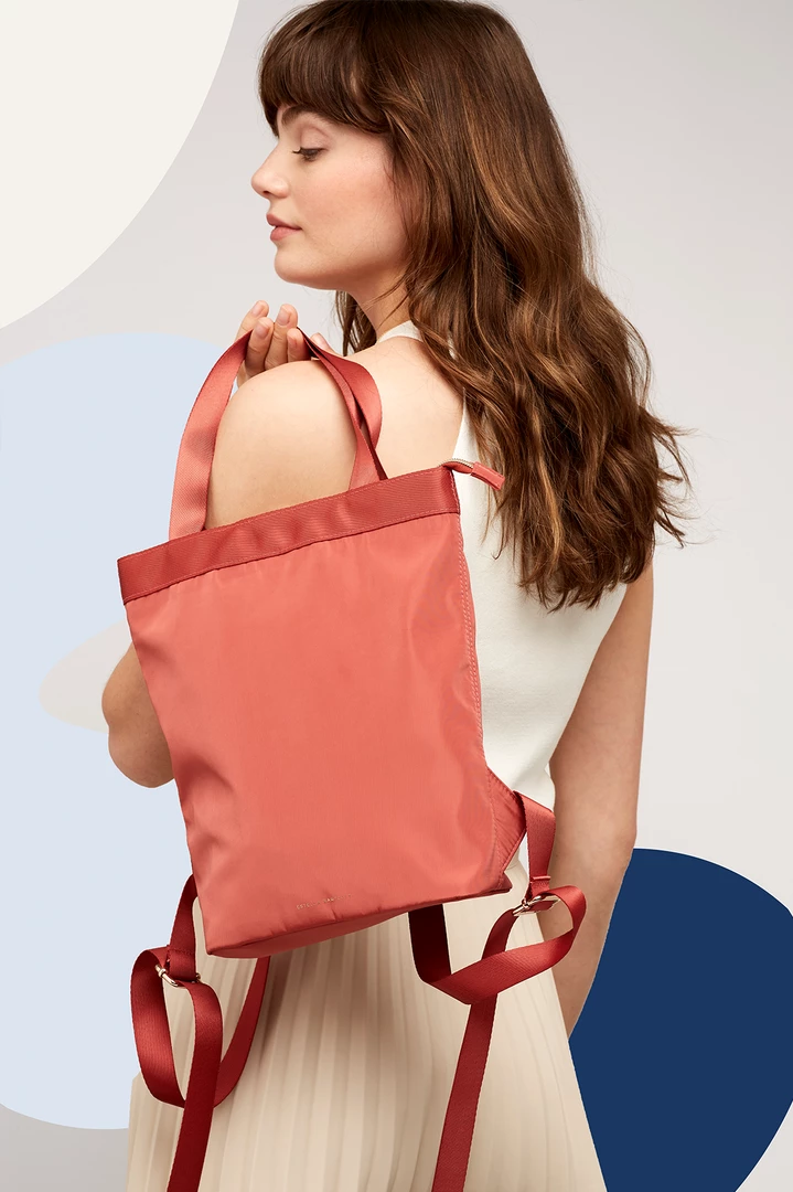 In durable nylon for a contemporary feel The Kirby Totepack is both stylish and practical. This beautiful antique rose bag features signature Estella Bartlett hardware. With more than enough room for your essentials and two internal pockets to keep you organised. Can be worn as a backpack or a tote.