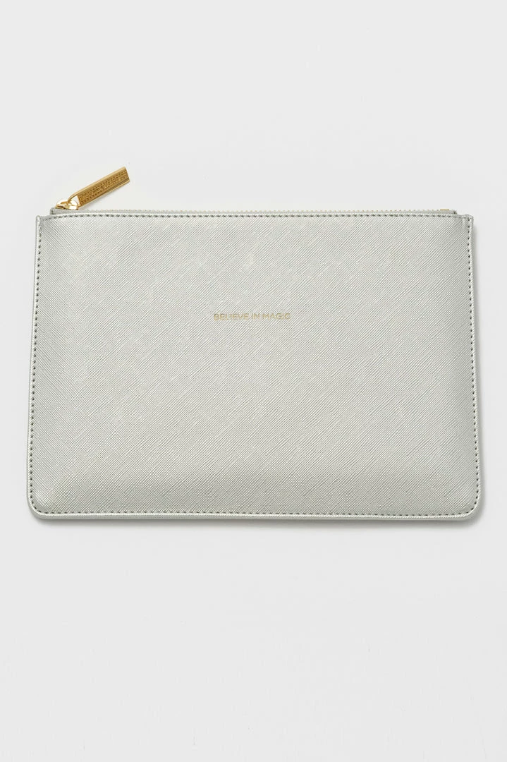Complete your look with this silver ‘Believe In Magic’ Medium Pouch. This is the perfect accessory to carry everything you need, everywhere you go. Made from vegan friendly leather, this pouch features an embossed message with a gold zip.