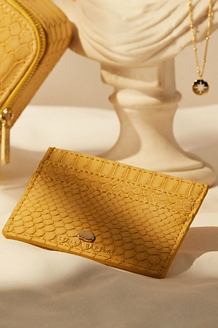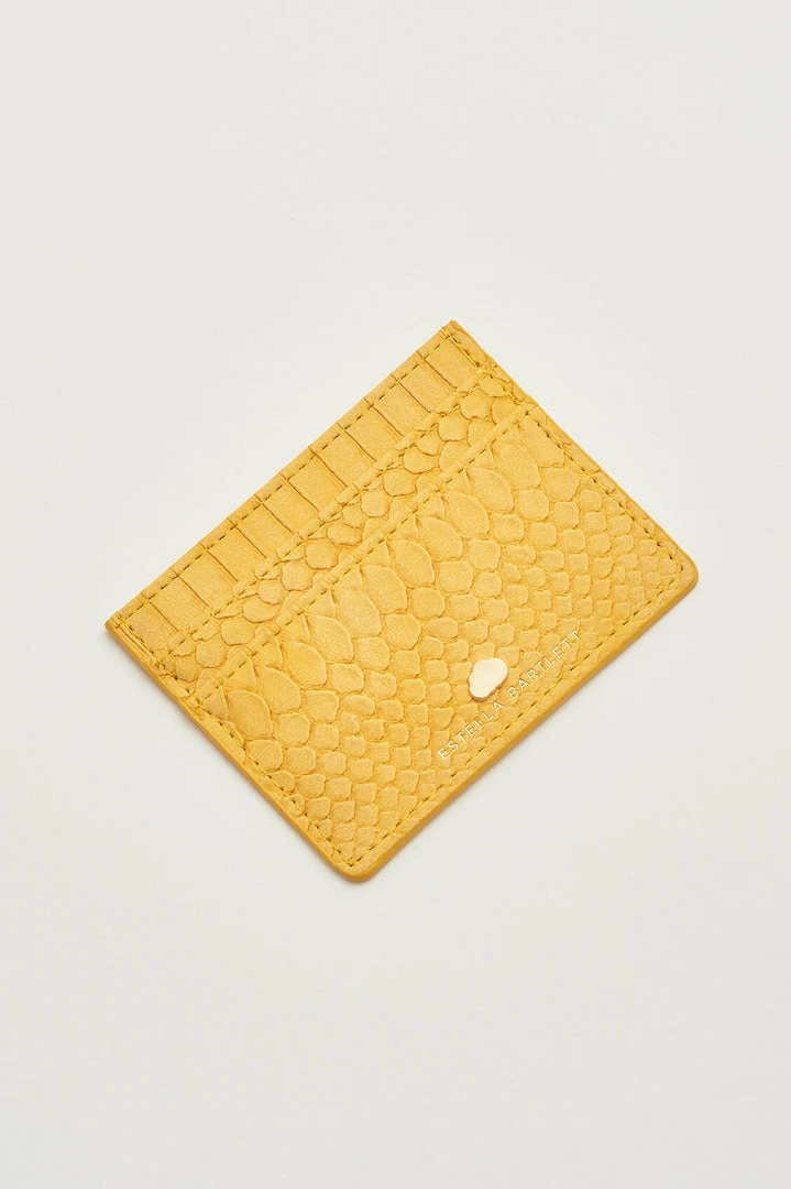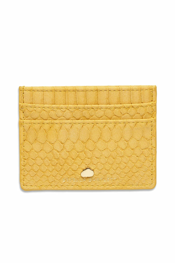 Perfectly sized to slip into your pocket or clutch, this card holder has two slots for your most used cards, plus a central compartment to store bills and loose receipts. With signature Estella Bartlett hardware and finished in a dreamy mustard snake print.
