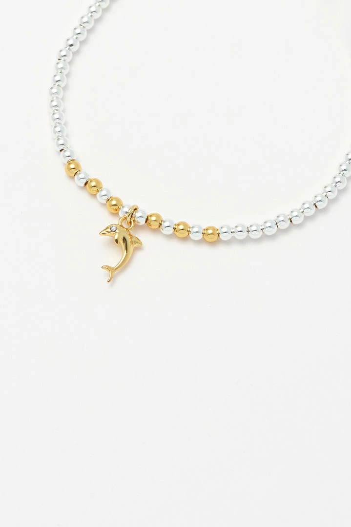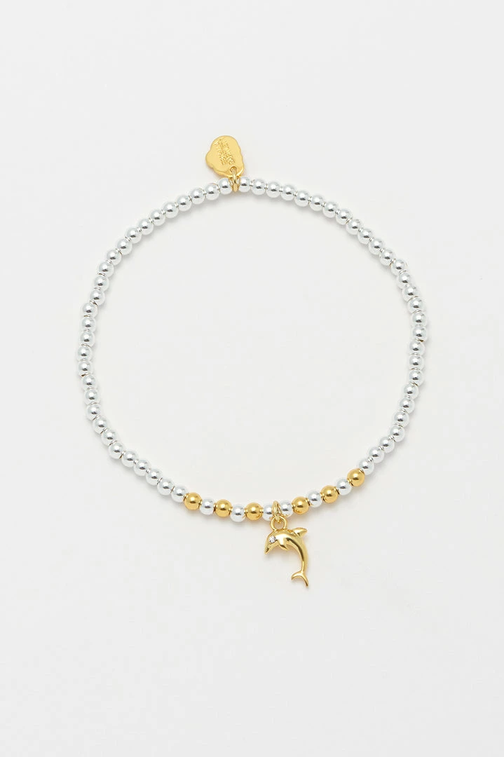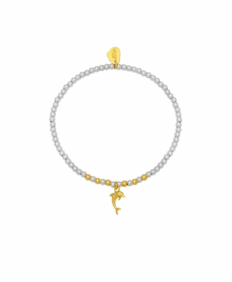 A companion to the Dolphin Pendant, this bracelet will be your new good luck charm. A dolphin charm sits between gold and silver plated beads on a stretch bracelet making it an easy gift for a special someone or to wear yourself for a playful look.