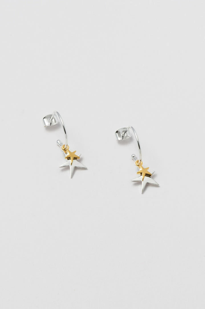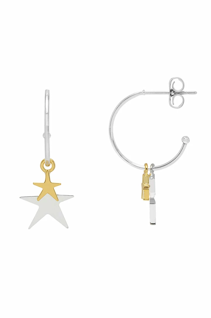 Starry nights abound with these delicate Double Star Drop Hoops. These mixed metals charms beautifully pair two elegant hand drawn stars, creating a layered effect that is sure to spark conversation. This pair of drop hoops are the perfect addition to any starry eyed look.