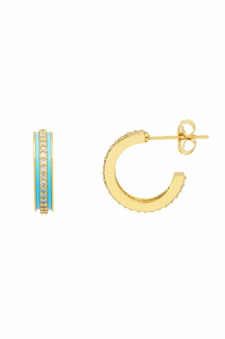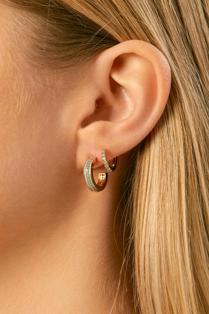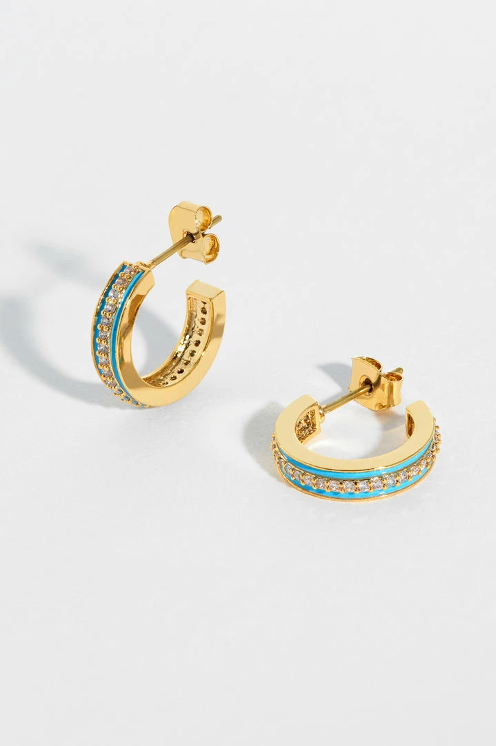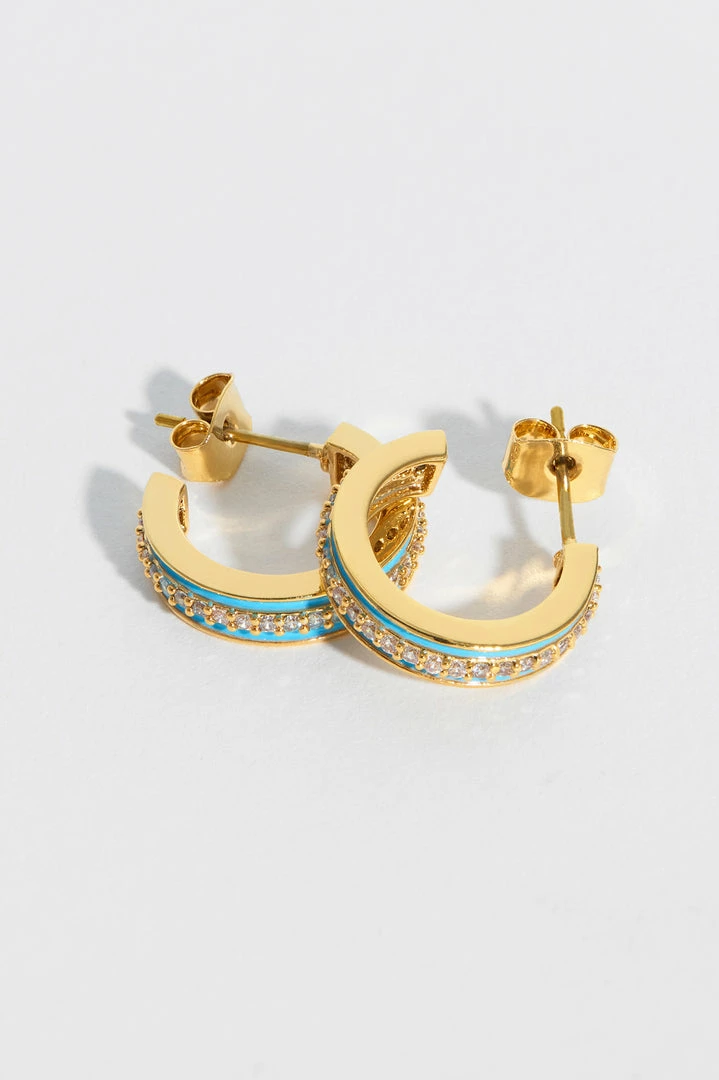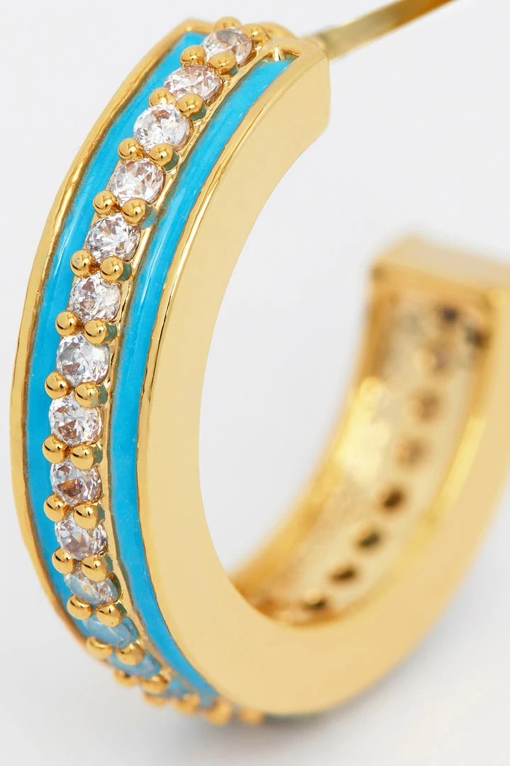 Add some bold colour to your ear with the Enamel CZ Hoops. Featuring thin gold plated hoops coated in glossy blue enamel, the encrusted CZ stones add a delicate shine to any look.