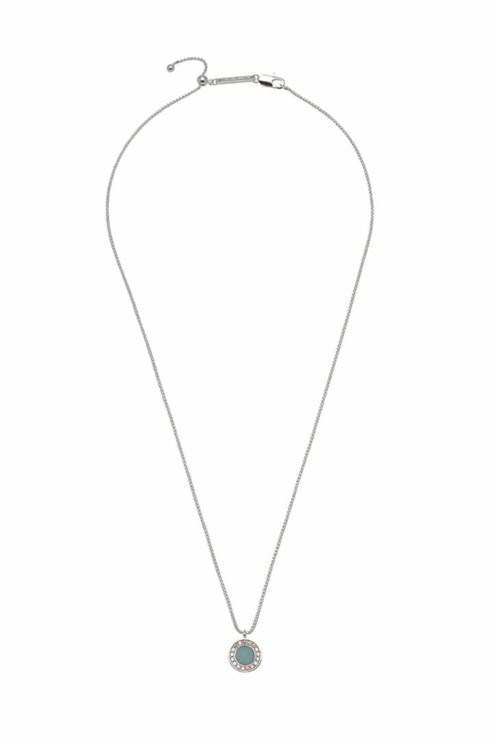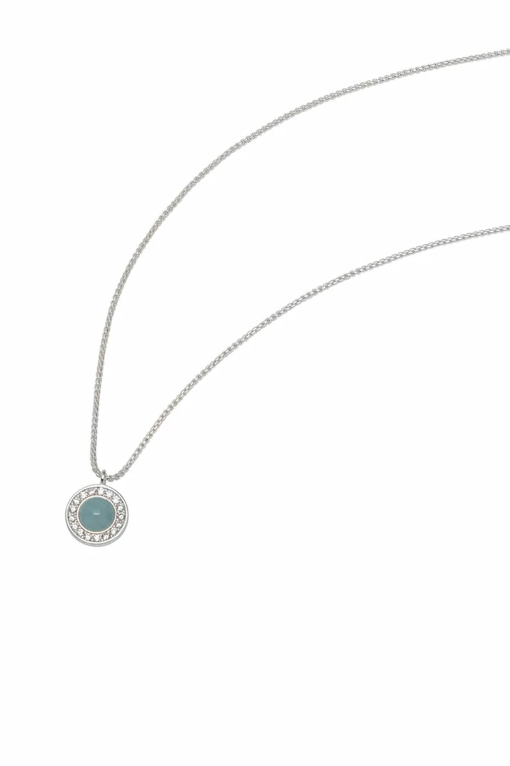 This demure necklace features a stunning aquamarine gemstone accentuated by a silver plated disc and set with sparkling cubic zirconia. Style solo or layer with minimalist silver chains for a statement look.