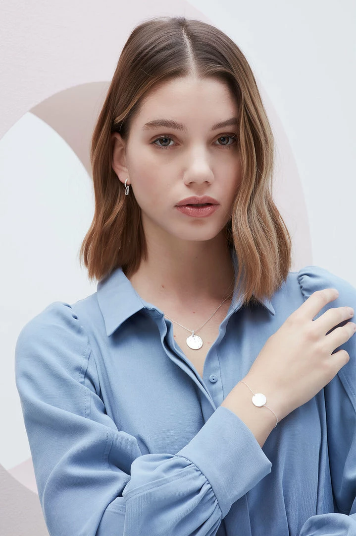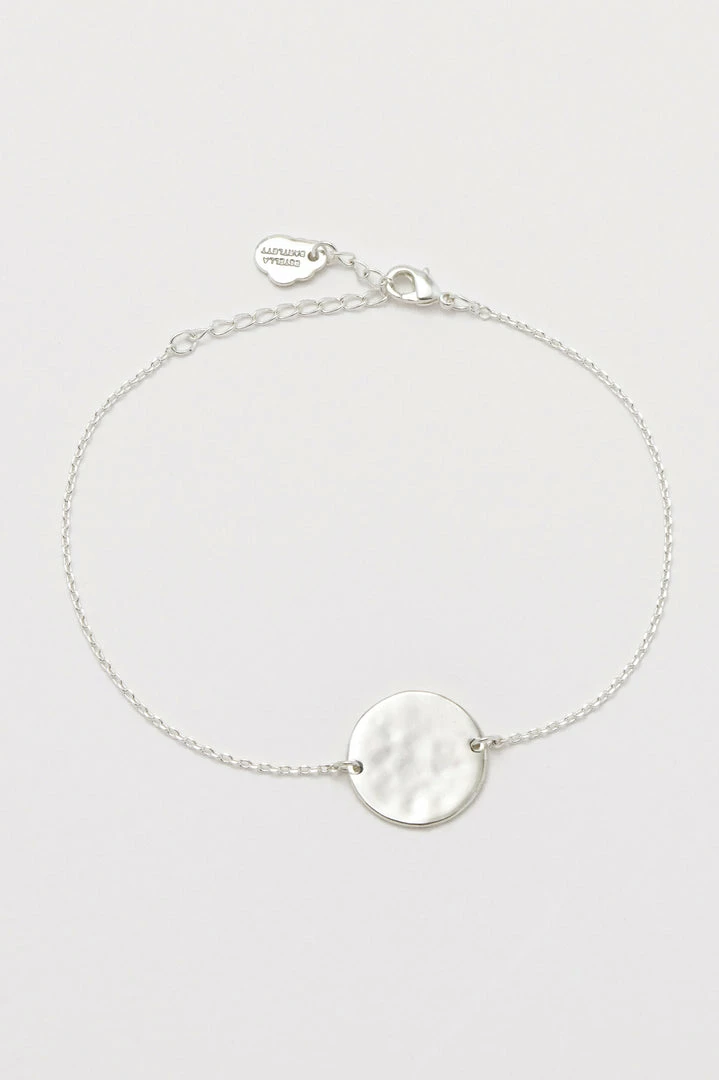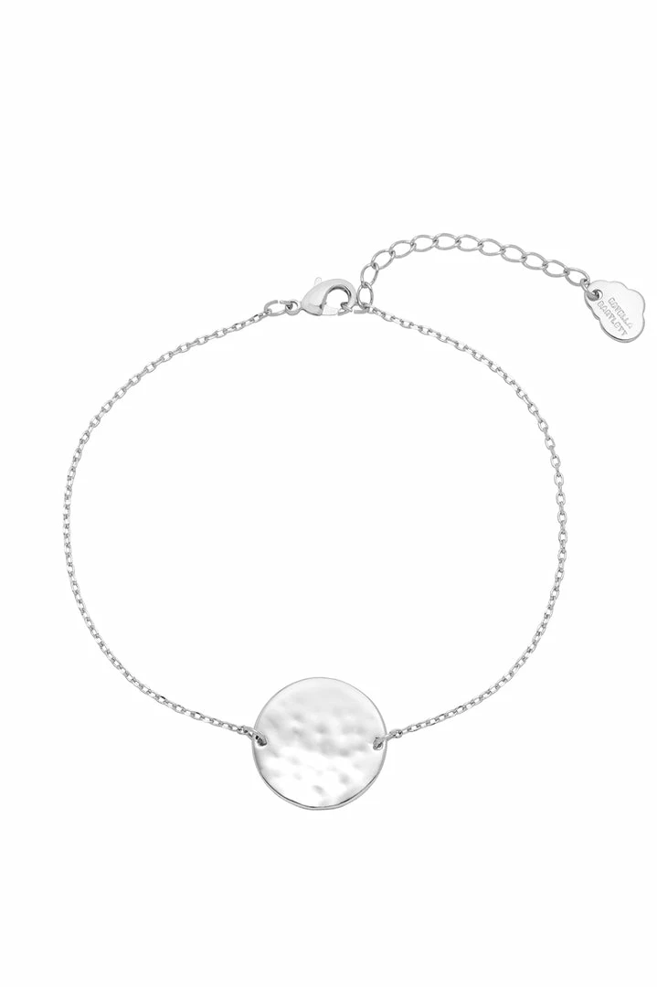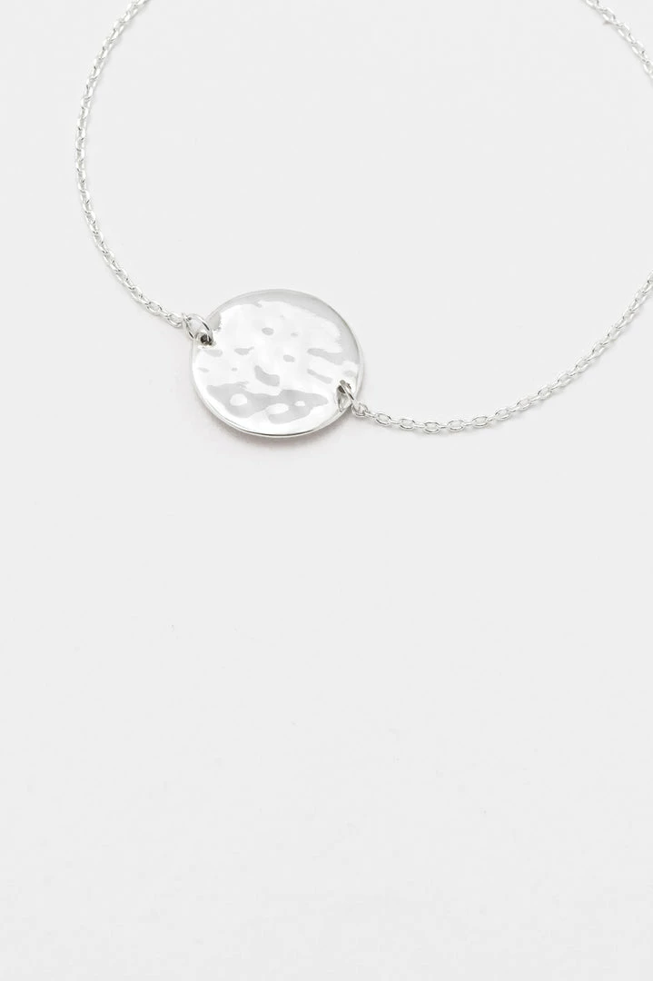 This statement bracelet features a silver plated hammered disc. The unique pattern and texture make this simple chain the perfect addition to your jewellery box.