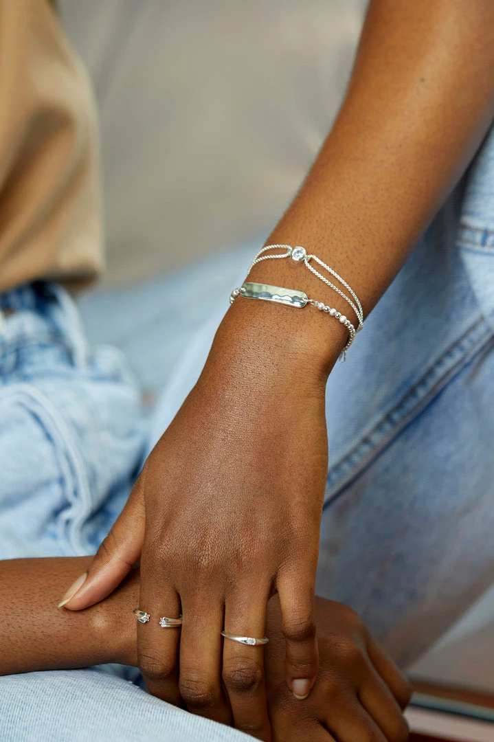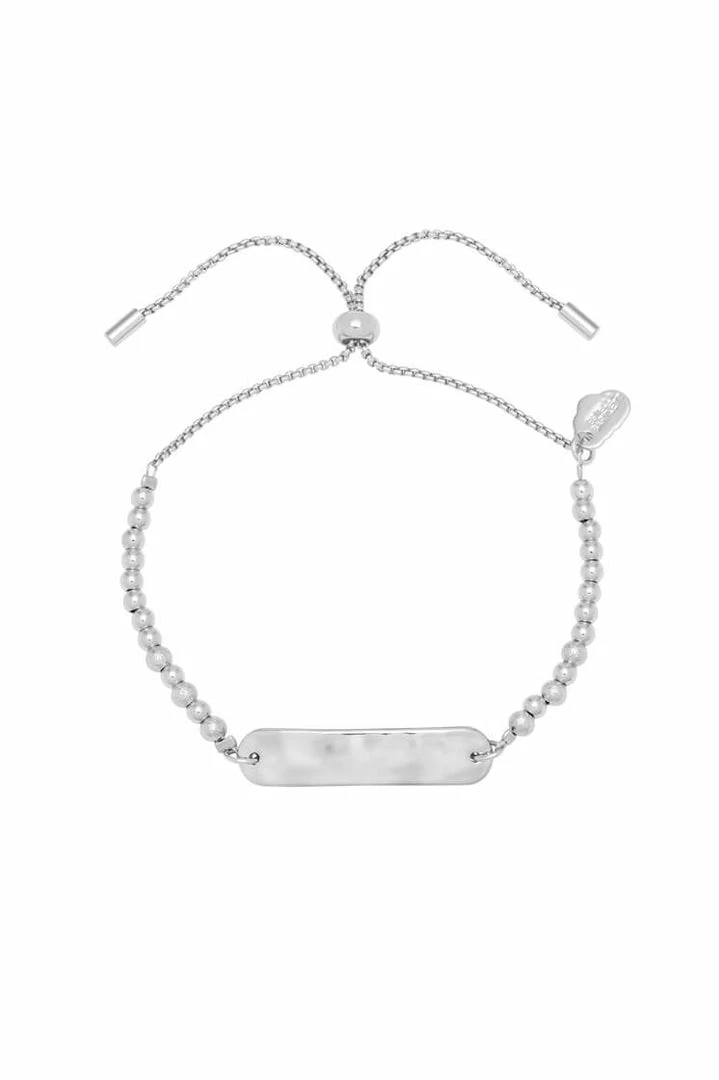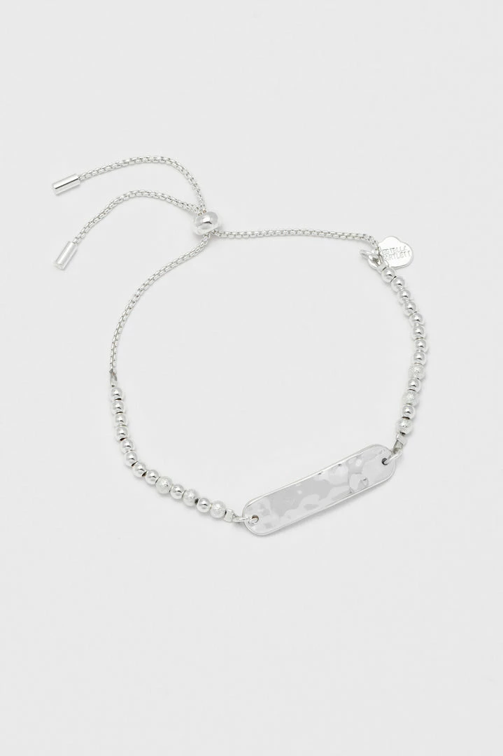 This chic and modern accessory is a style staple. Featuring a string of delicate silver beads and a central silver plated textured ID bar, this Amelia Bracelet is perfect styled solo or stacked alongside other bracelets for a statement look.