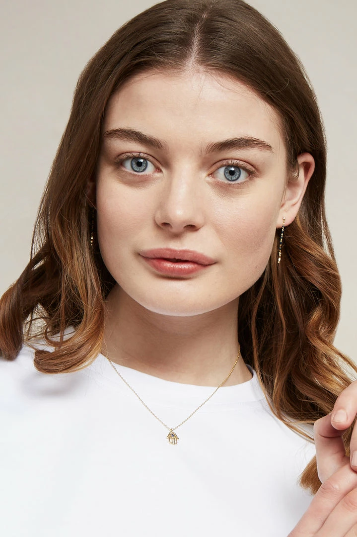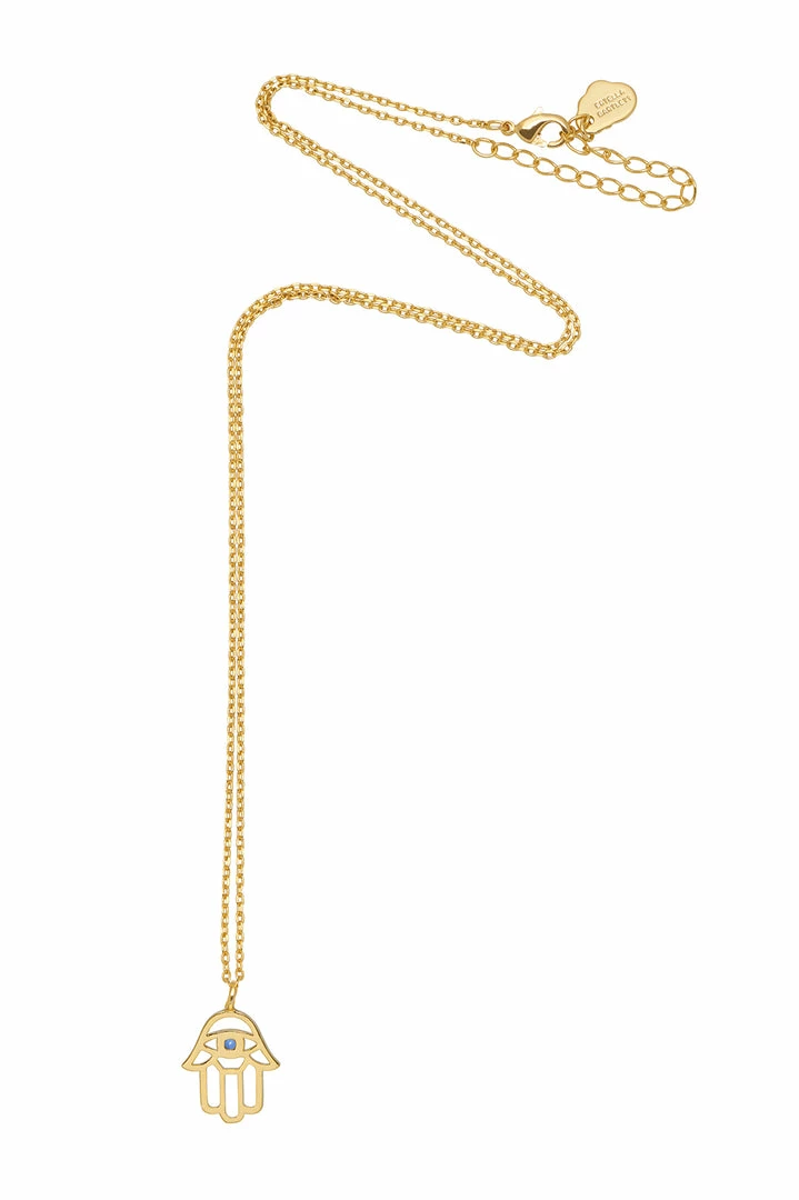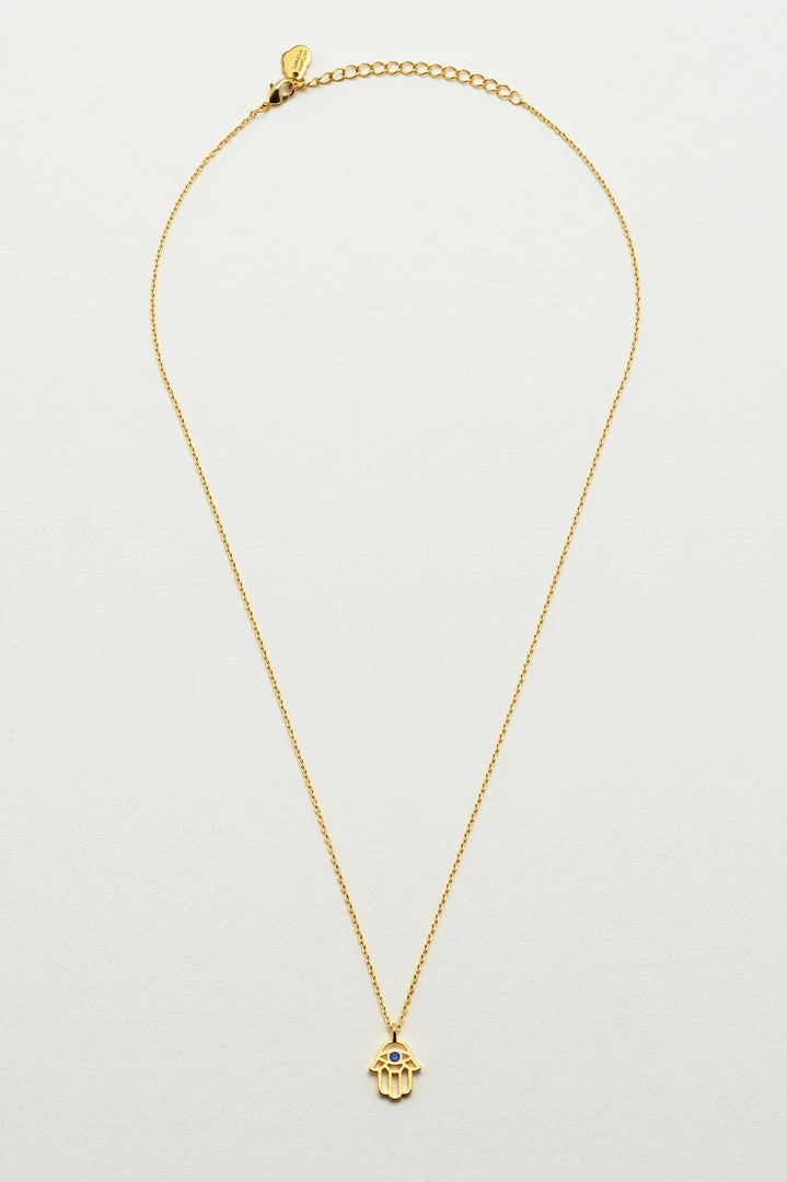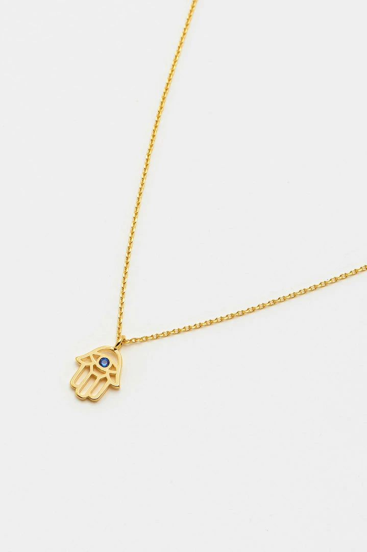 The Hasma Hand Necklace features a blue cubic zirconia, the perfect accompaniment to any outfit!