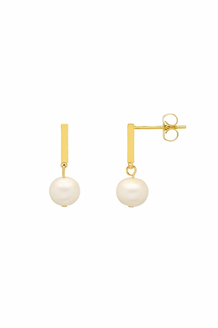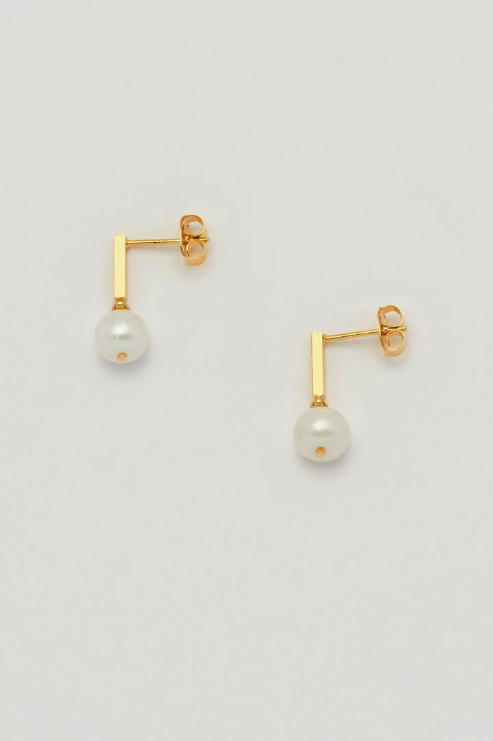 These delicate Baroque Pearl and Bar Drop Earrings are both classic and modern. Featuring a chic natural pearl hung from a sleek gold plated bar, this minamlist accessory will effortlessly elevate your ear-game in one simple step.