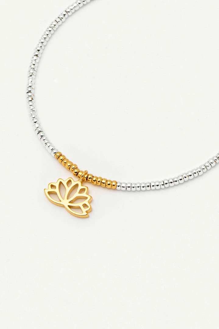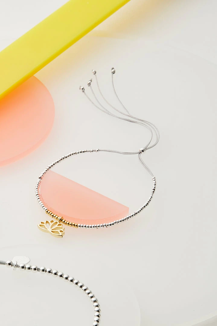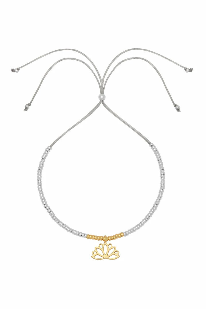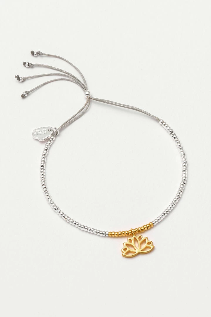 This modern take on the friendship bracelet displays gold and silver plated beads on a grey cord and is finished with a gold plated lotus flower charm. The lotus flower is symbolic of strength, purity and patience. This is a great piece to layer with other bracelets in complementary colours.