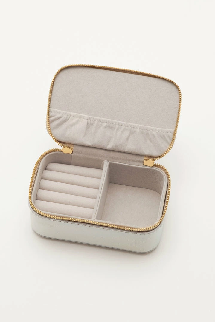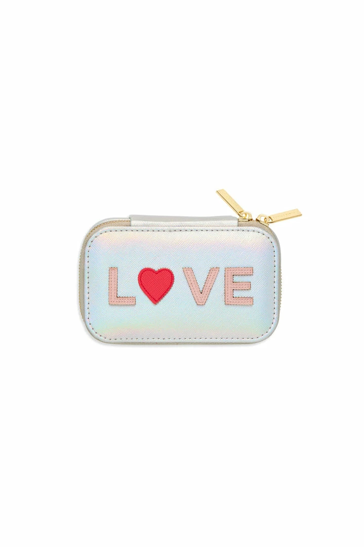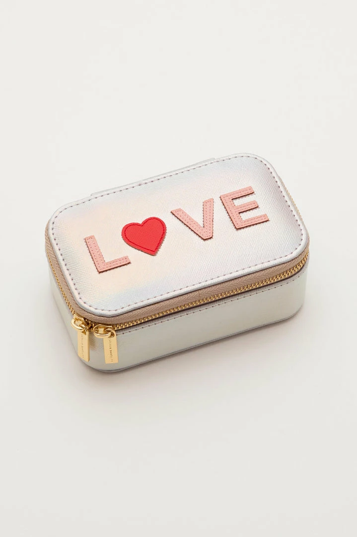 Keep all of your treasures safe with our mini jewellery box. With compartments for earrings, bracelets and necklaces. Finished in an iridescent vegan leather with bold applique in blush and coral, this mini jewellery box is the perfect way to keep everything organised when you’re on the go.