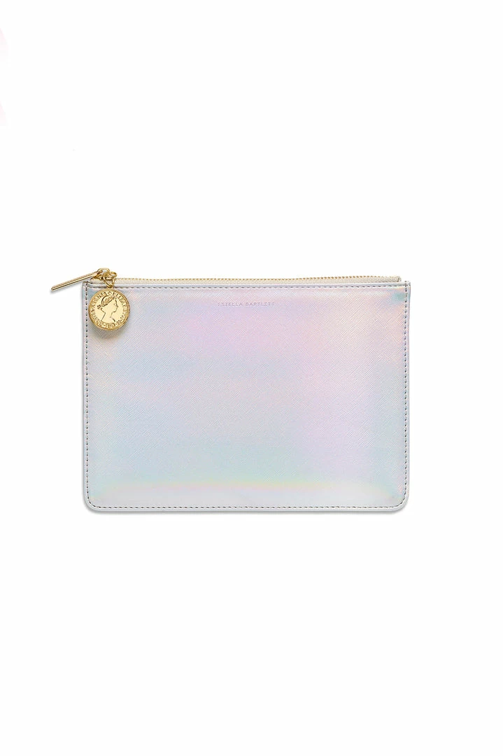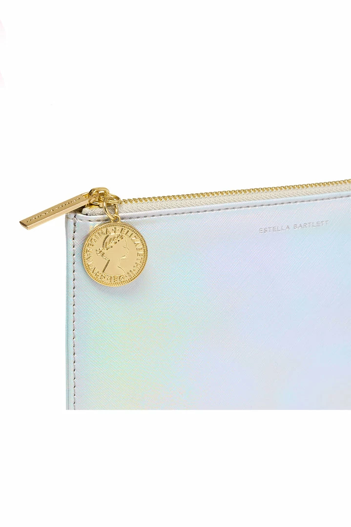 Carry it under-arm or use it to keep your essentials secure and within reach inside your bag. The slim style is finished in a glowing iridescent colour and comes with a lucky six pence coin charm.