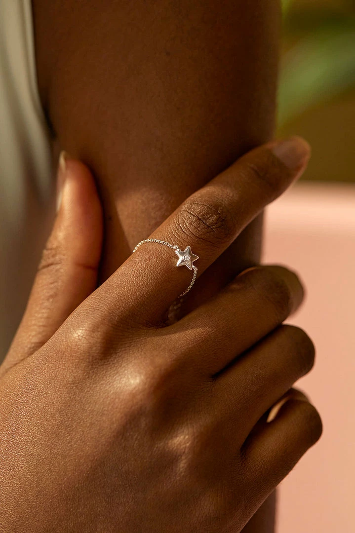 Elevate your ring stack with this Mini Star CZ Adjustable Chain Ring. Adorned with a sparkling gold plated heart charm and featuring an easily adjustable chain so that it can be worn on any finger.