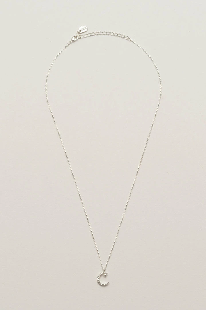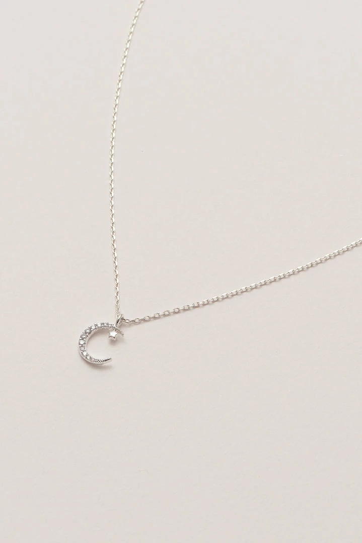 This Moon and Star Necklace features a silver plated crescent moon with a star.