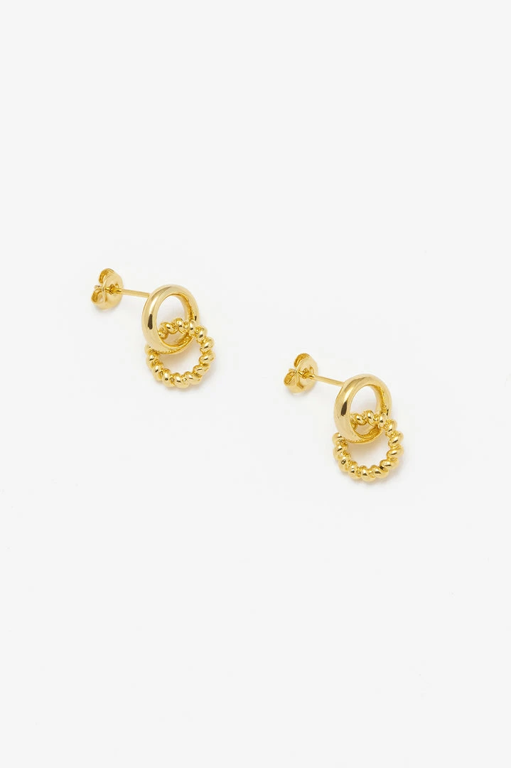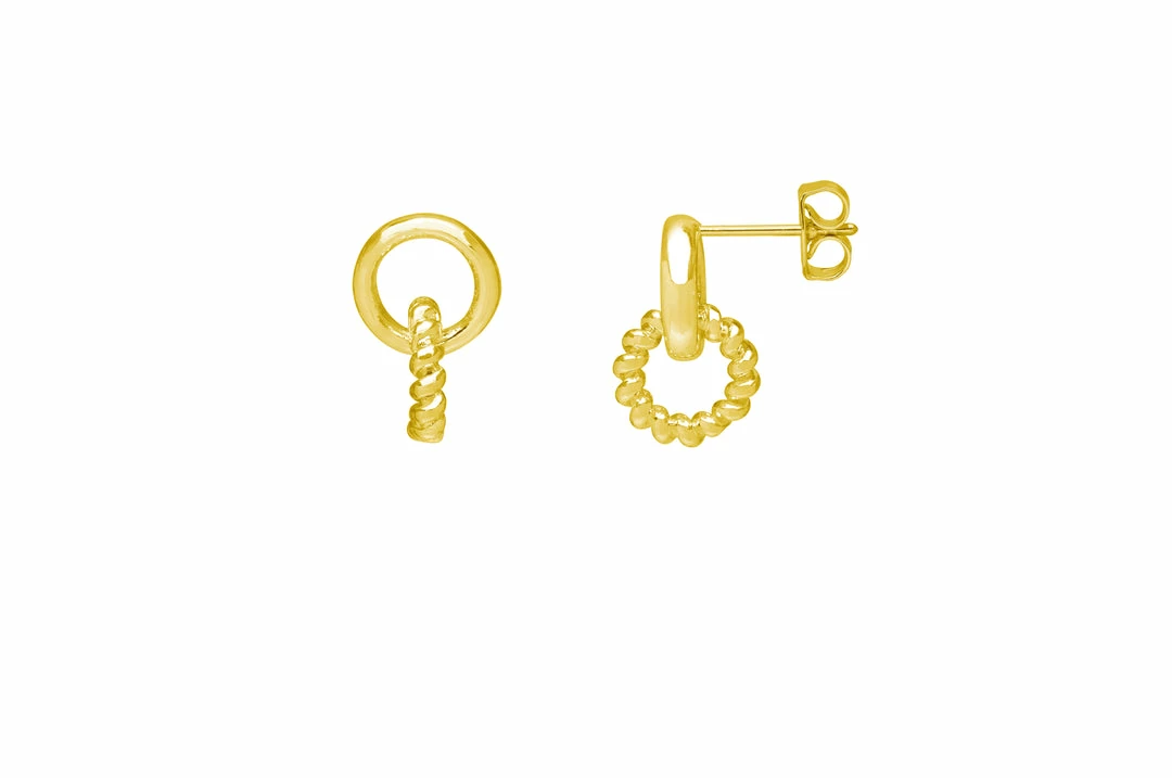 This textured piece is a classic with one plain gold plated ring interlocking with one twisted ring. Elevate your look with this modern take on the everyday stud earrings, layer with our other gold plated hoops and stud earrings for a completed look.