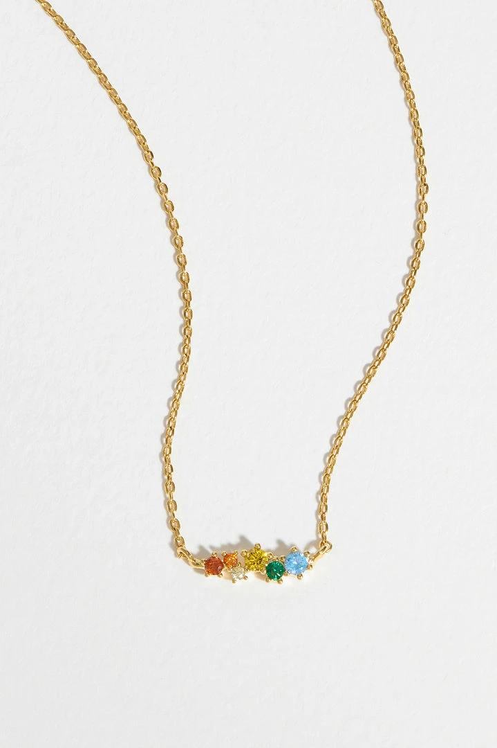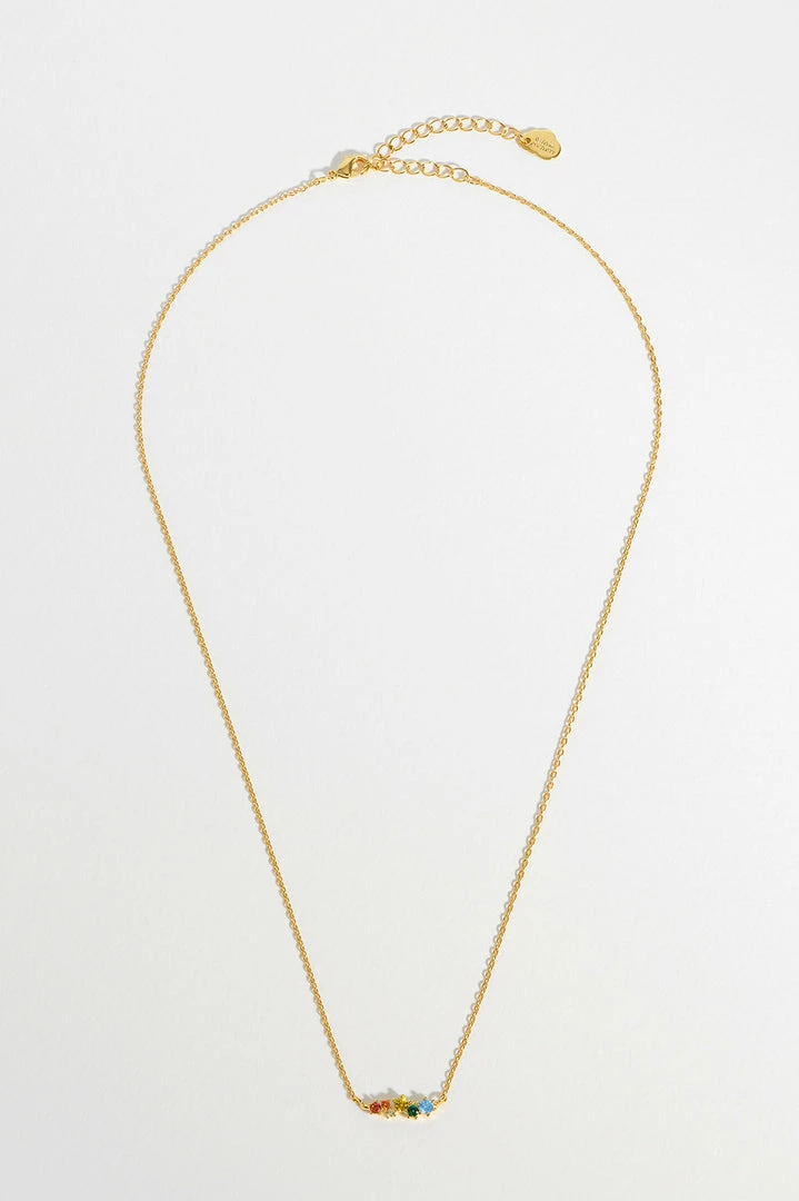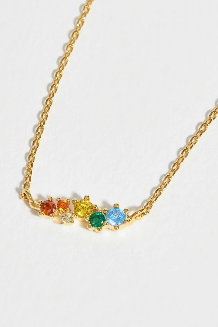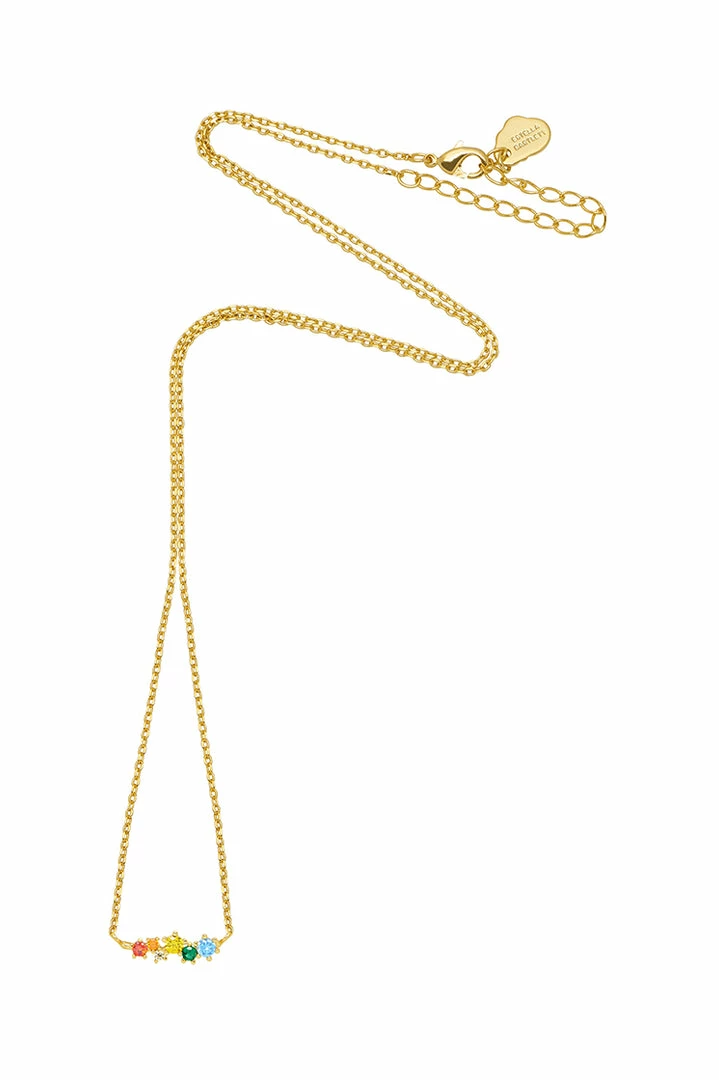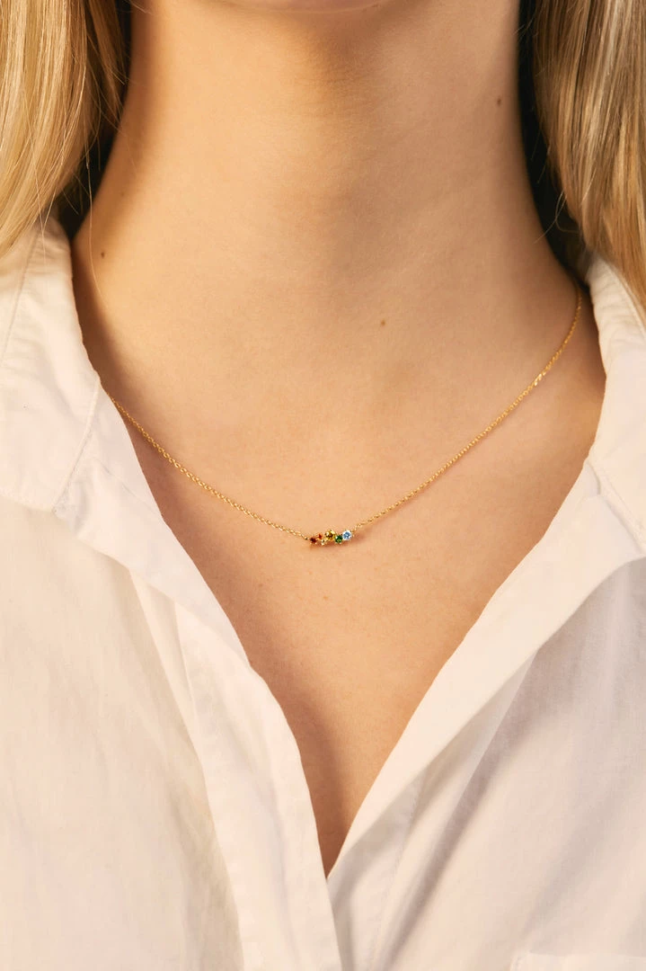 A matching necklace to the Rainbow Constellation Hoops, this gold plated necklace features an intricate cluster of rainbow coloured CZ stones. Showcase elegance with this delicate necklace or layer with our other chains for a bright summer stack.