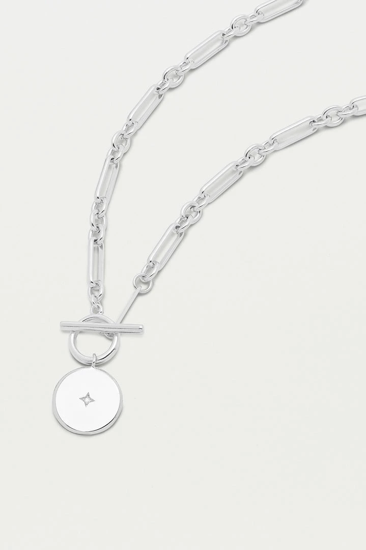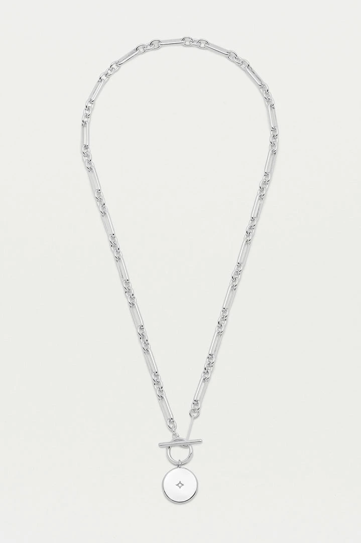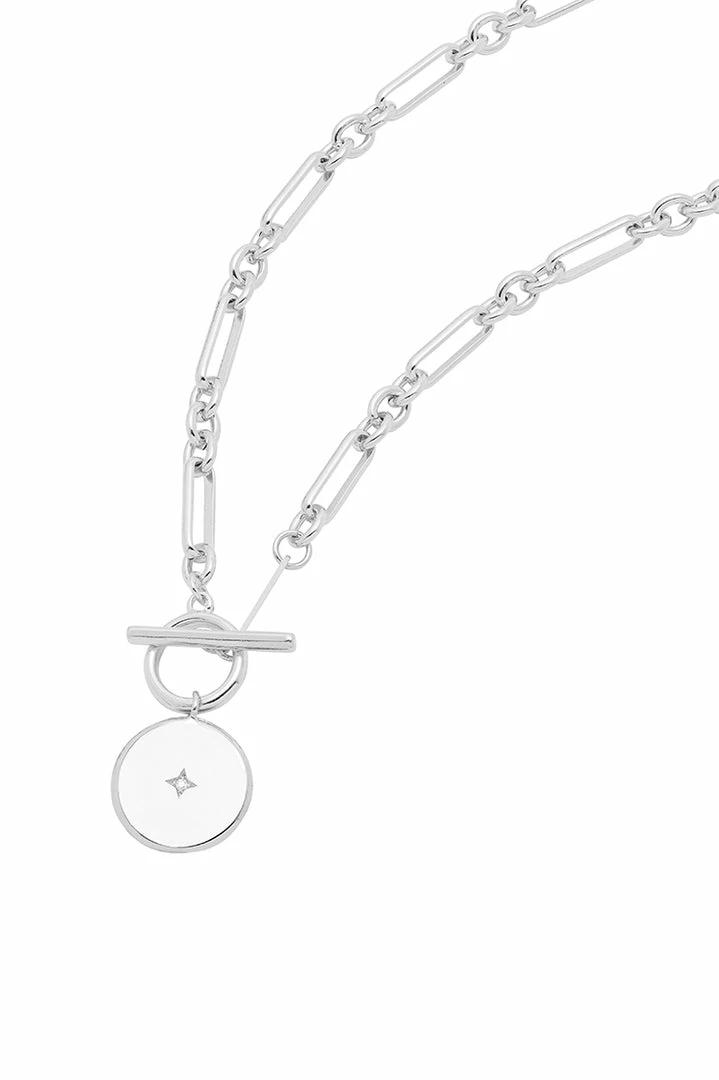 A new EB classic, our Star Coin T-Bar Chain features a chunky coin charm with an embedded CZ stone on a mixed link silver plated chain. Layer with our fine chains or wear alone for a stand-out look.