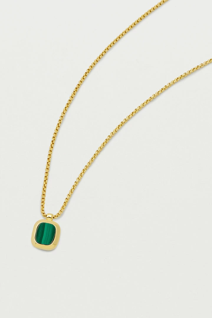 Add a pop of colour to your look with our Malachite Tablet Pendant. Known for its protective properties, the malachite stone offsets the gold plated chain to become an eye-catching piece in your layering stack.