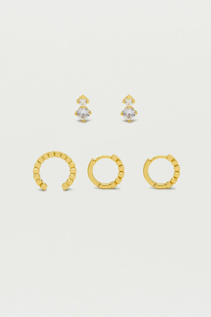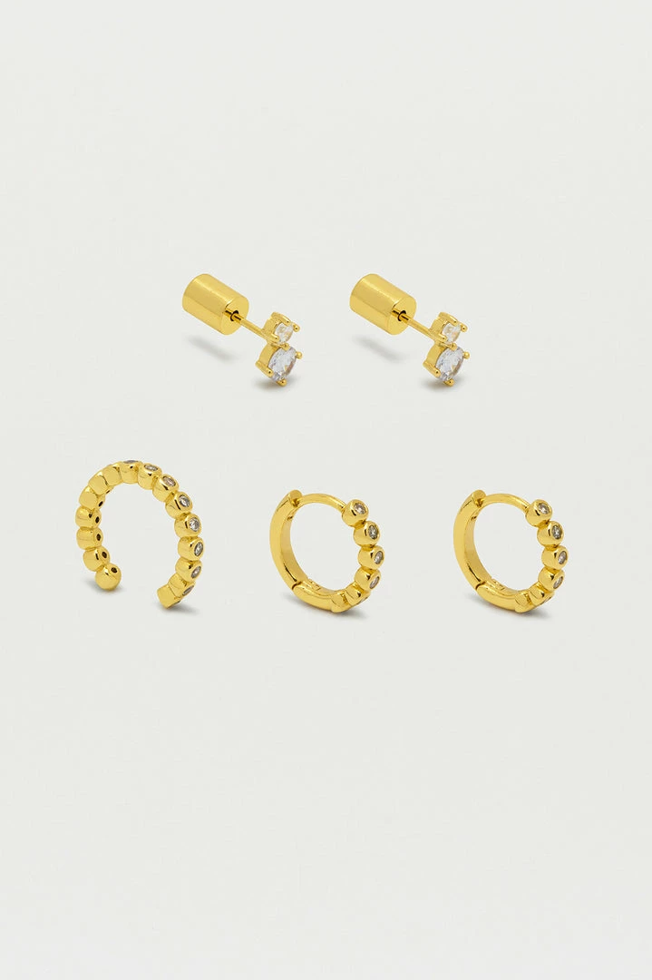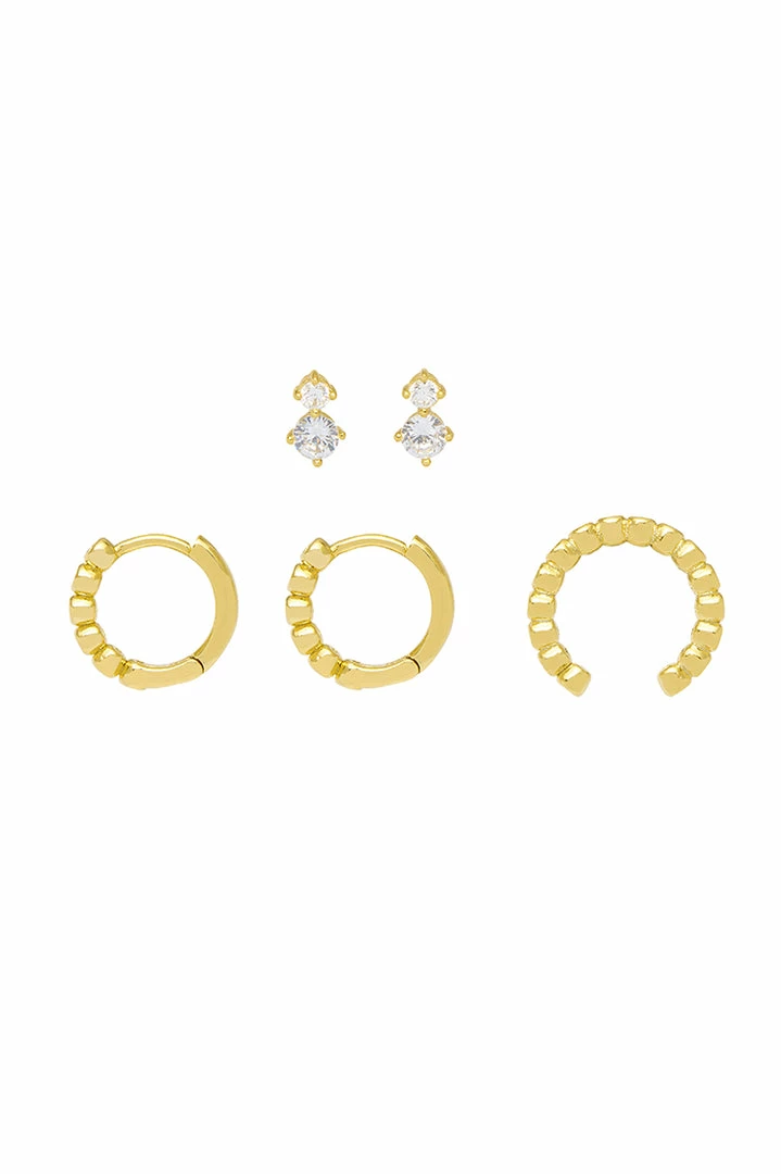 Ear stacking has just gotten easier with our Trio Earring Set. The set includes the EB favourite Gold Plated Mini Beaded Huggies, Ear Cuff and gorgeous Green Gemstone Stud Earrings.