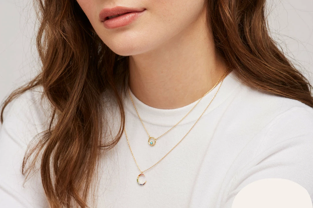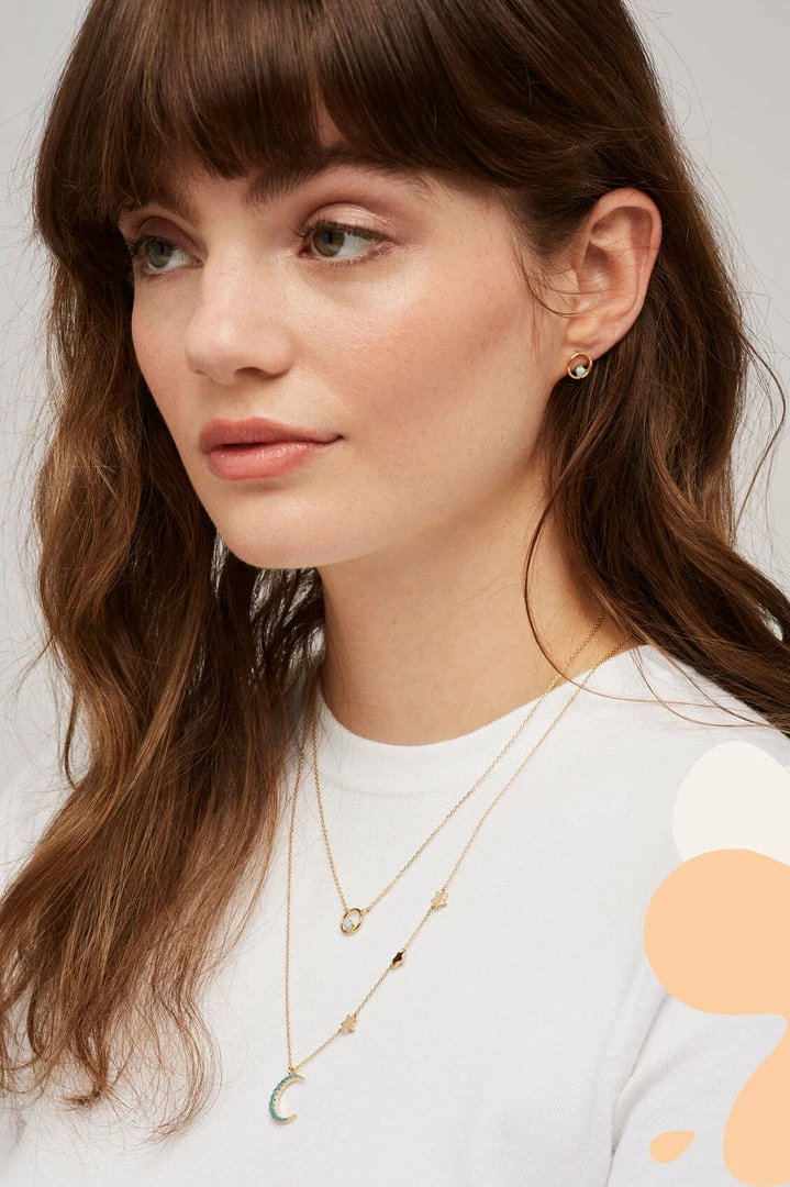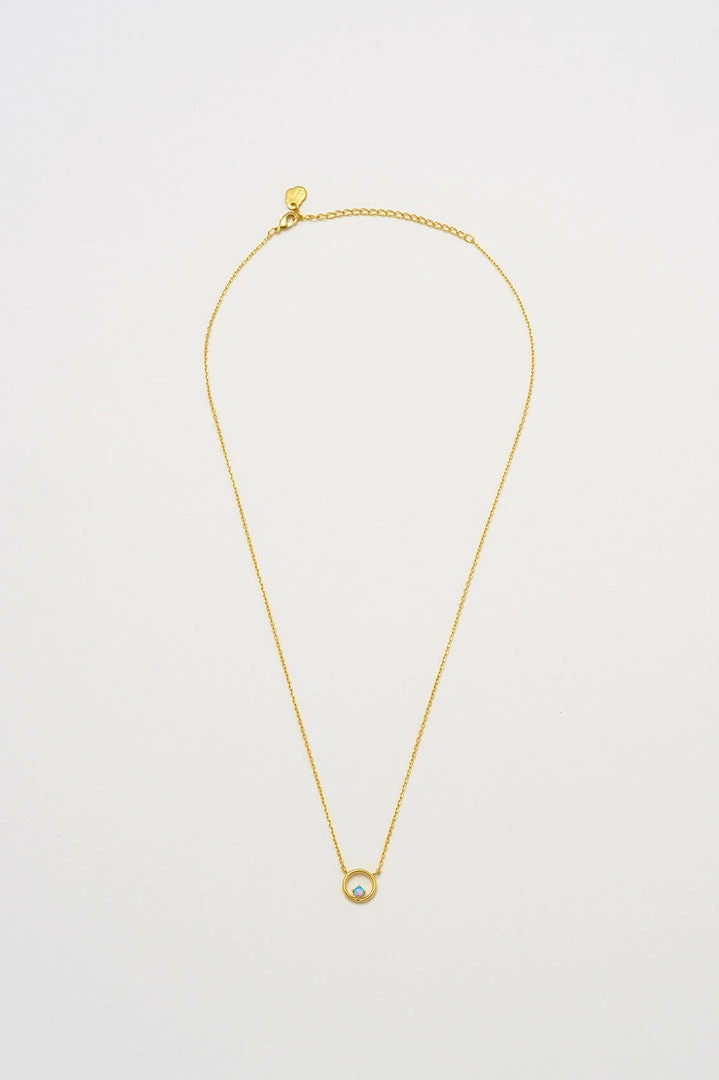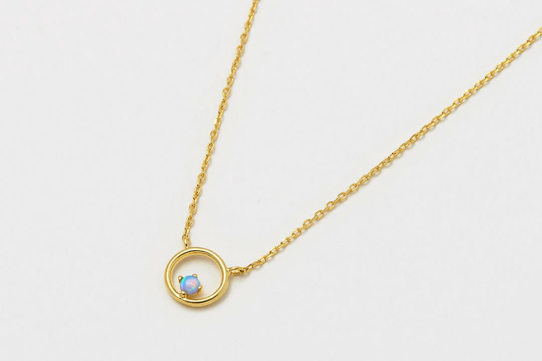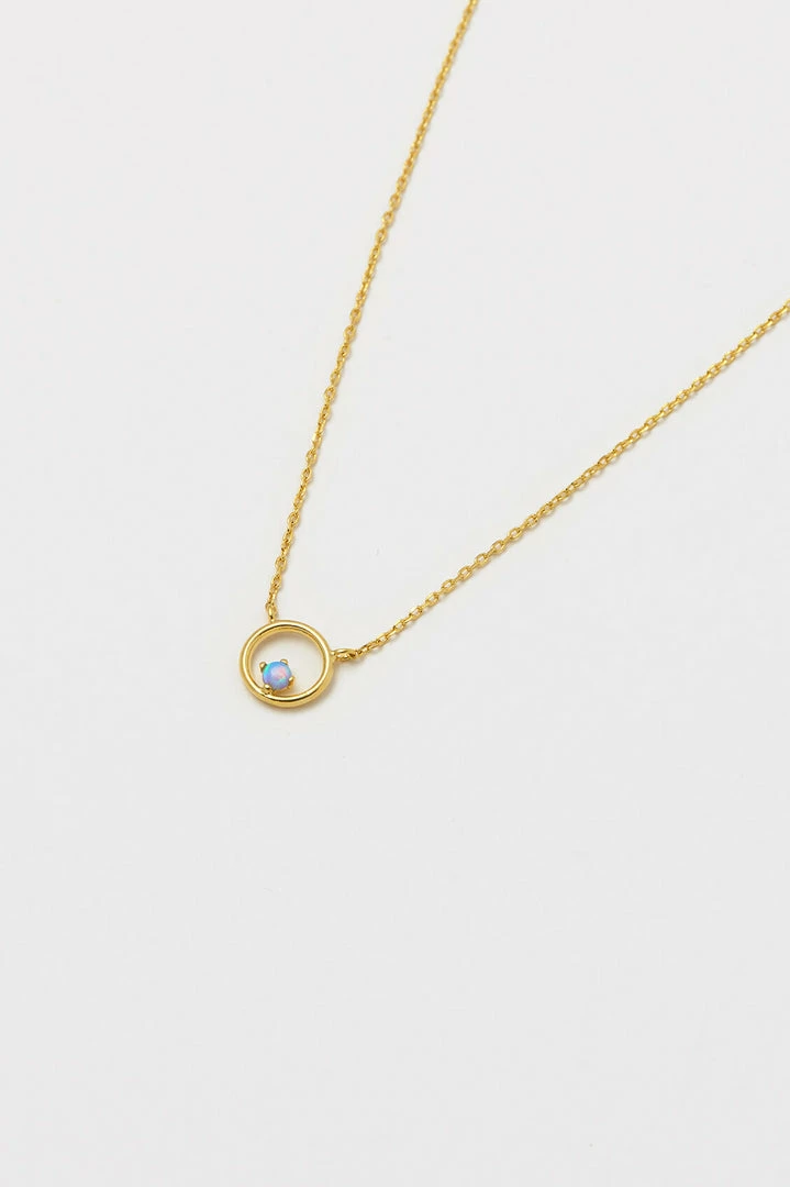The opal, an iridescent stone that is a cool and classic symbol of love and loyalty, sits at the heart of this open circle necklace. The tiny opal is framed by a simple gold plated circle. The delicate chain allows this necklace such versatility in its styling: it stands out beautifully on its own and can complement a range of other layered pendants.