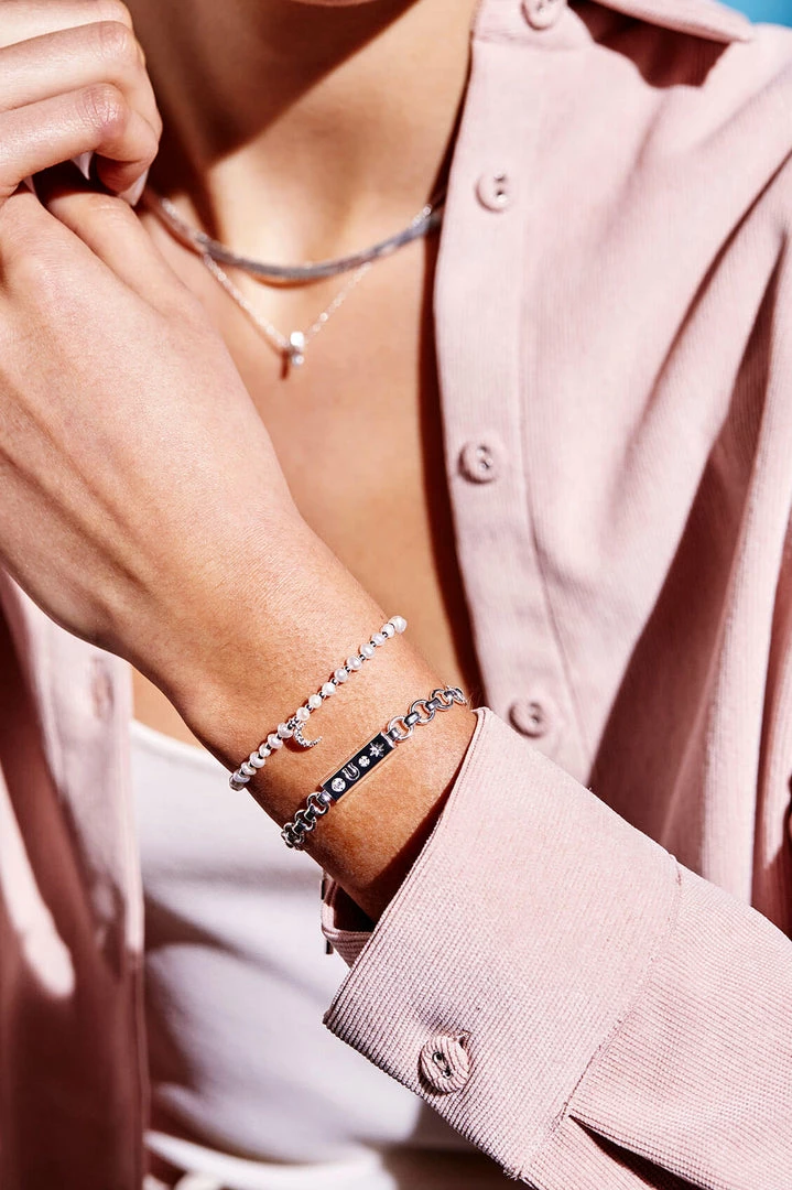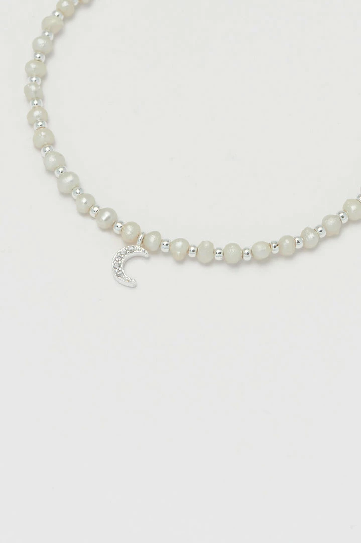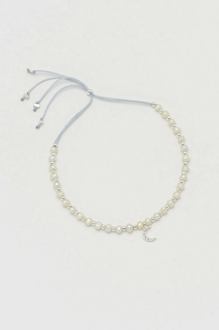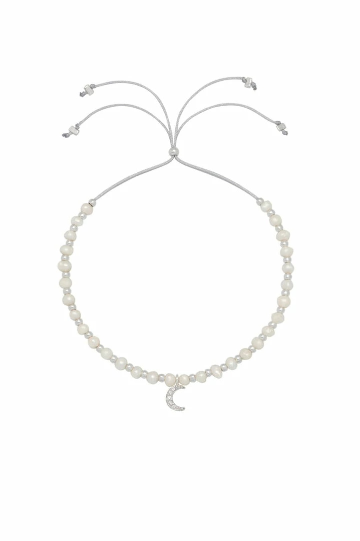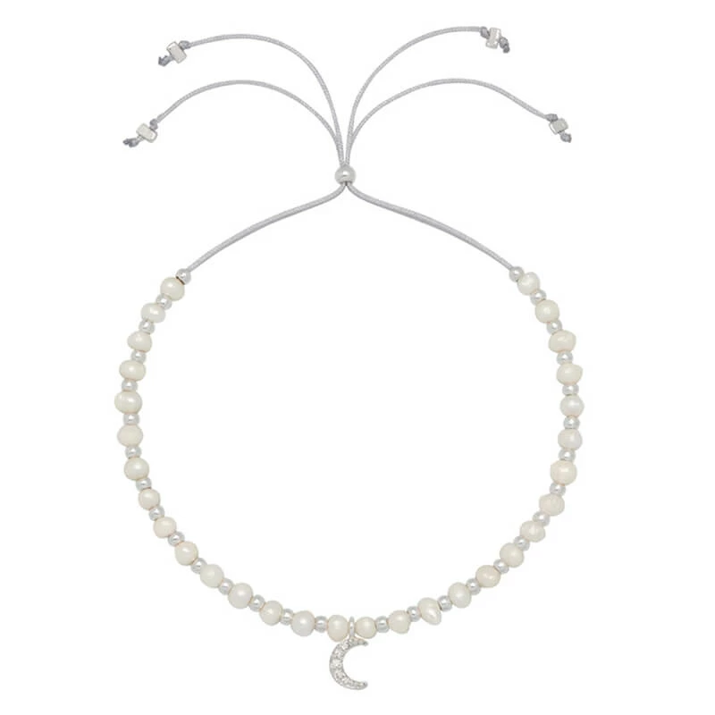 Our newest Louise Bracelet features a dazzling moon pendant set with cubic zirconia. This modern take on the friendship bracelet accentuates its central charm with a delicate string of alternating pearls and silver plated beads, displayed on an adjustable grey cord.