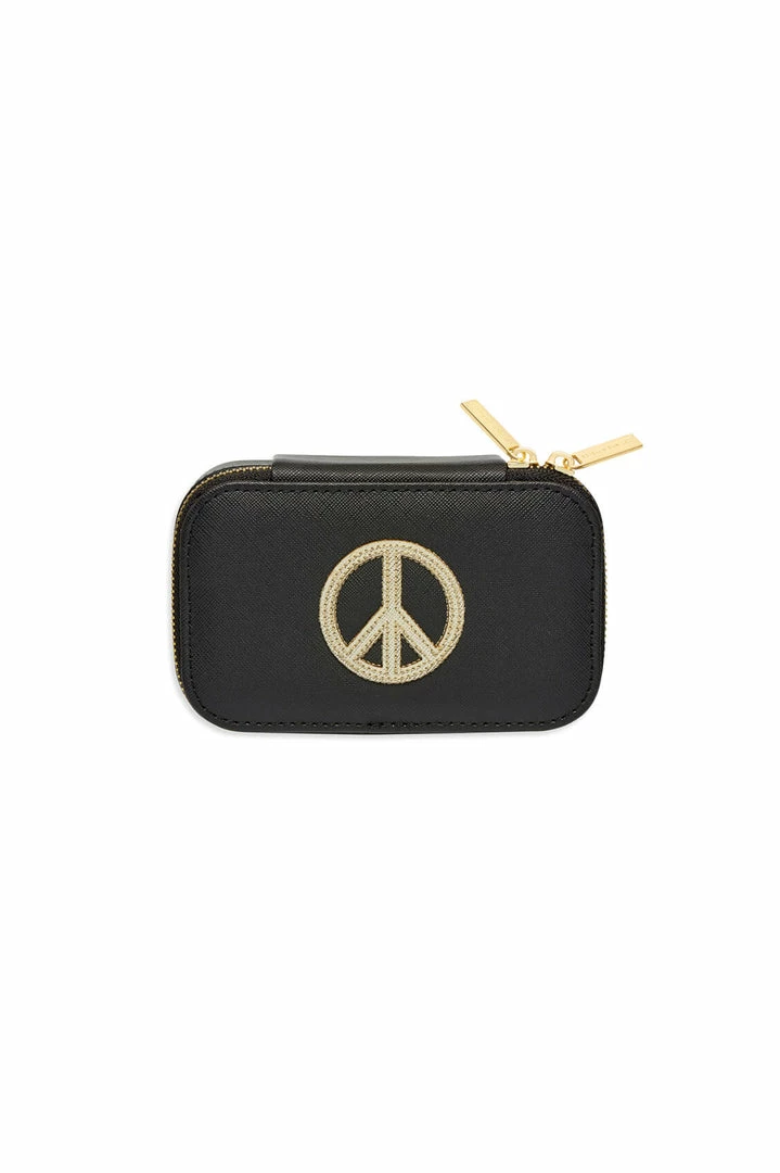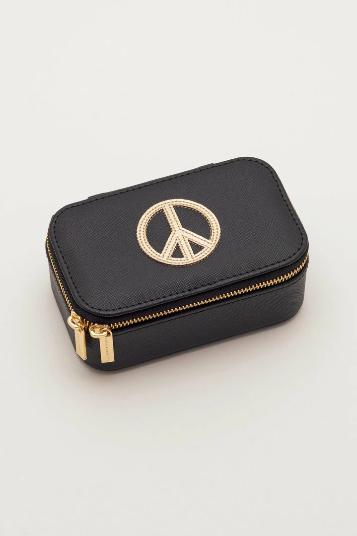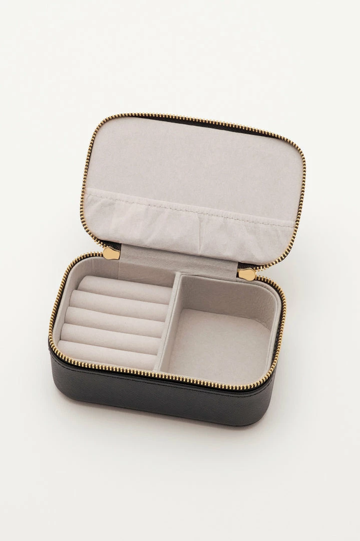 Keep all of your treasures safe with our mini jewellery box. With compartments for earrings, bracelets and necklaces. Finished in a black vegan leather with bold applique in gold, this mini jewellery box is the perfect way to keep everything organised when you’re on the go.