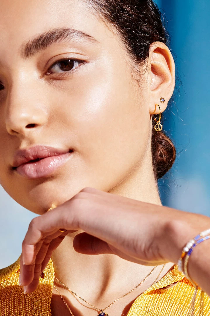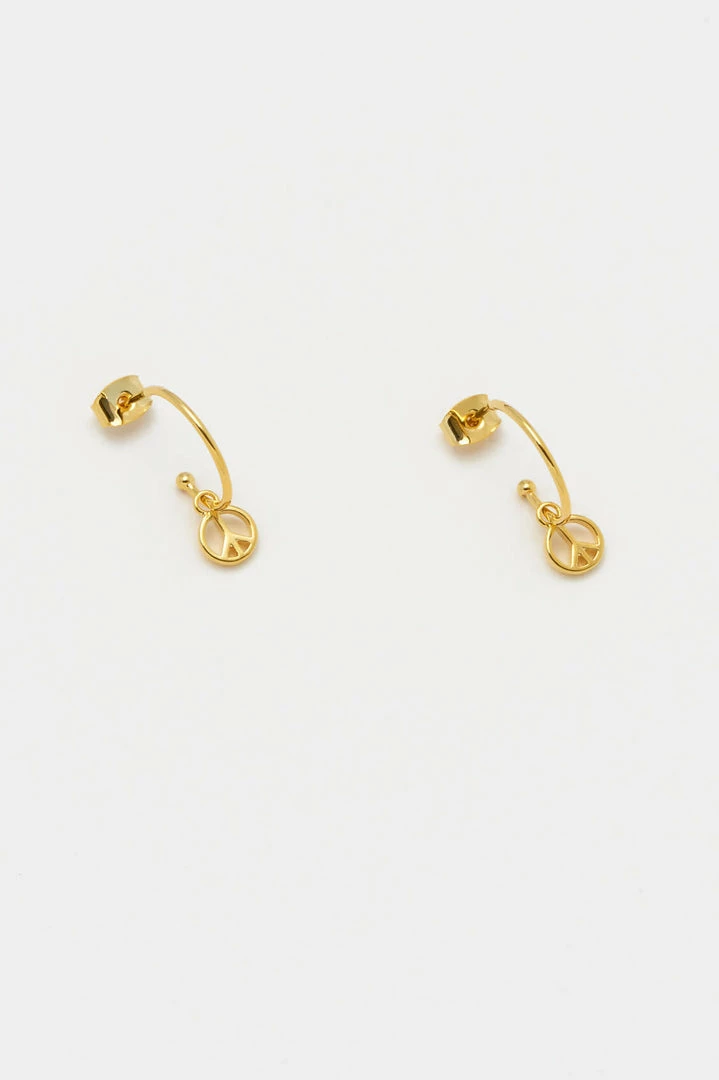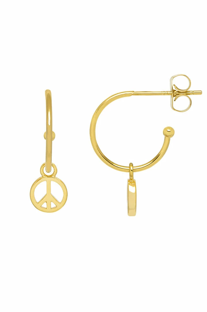 These classic gold plated hoop earrings add a playful twist with a delicate peace symbol pendant. Style solo, or stack alongside other earrings for a bolder look.
