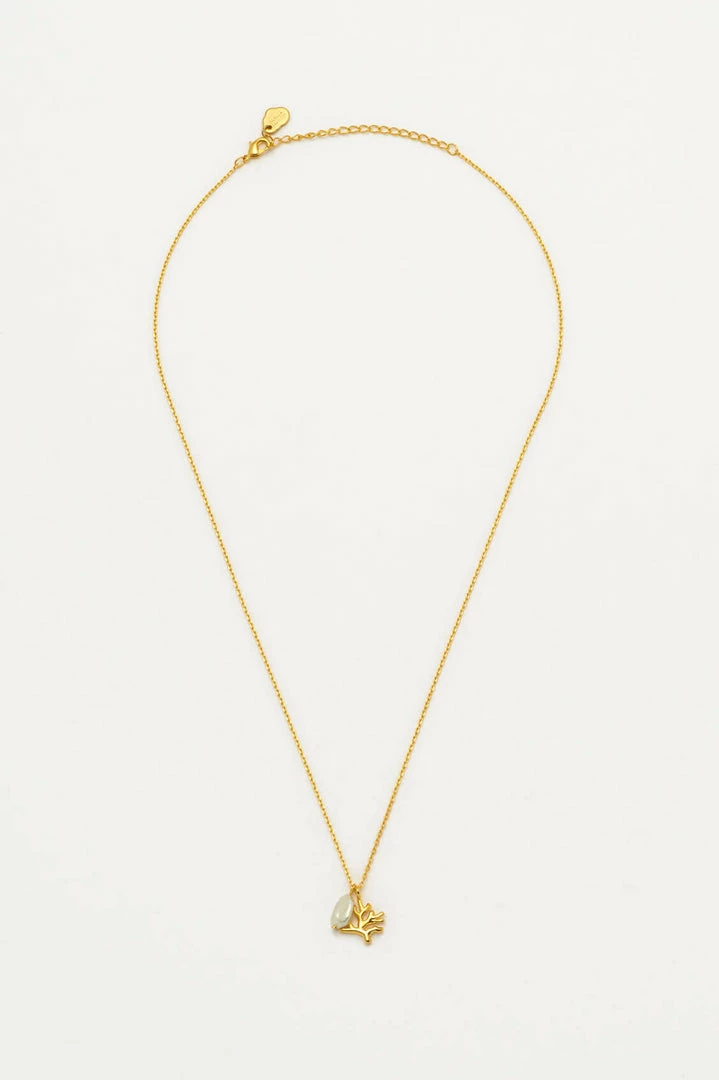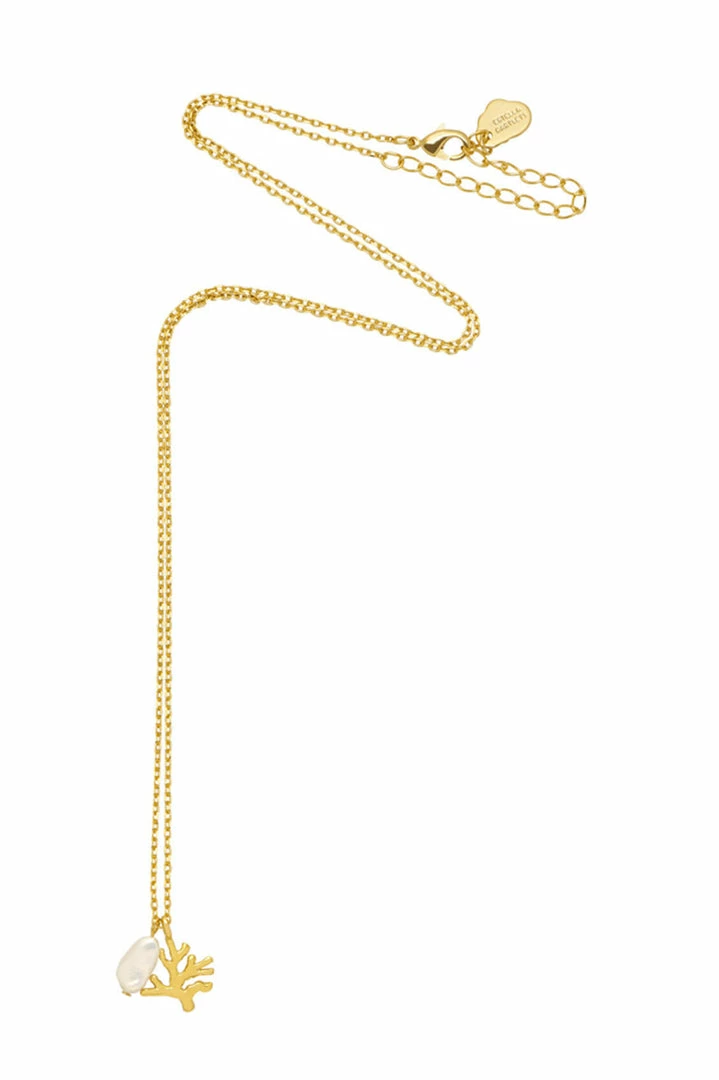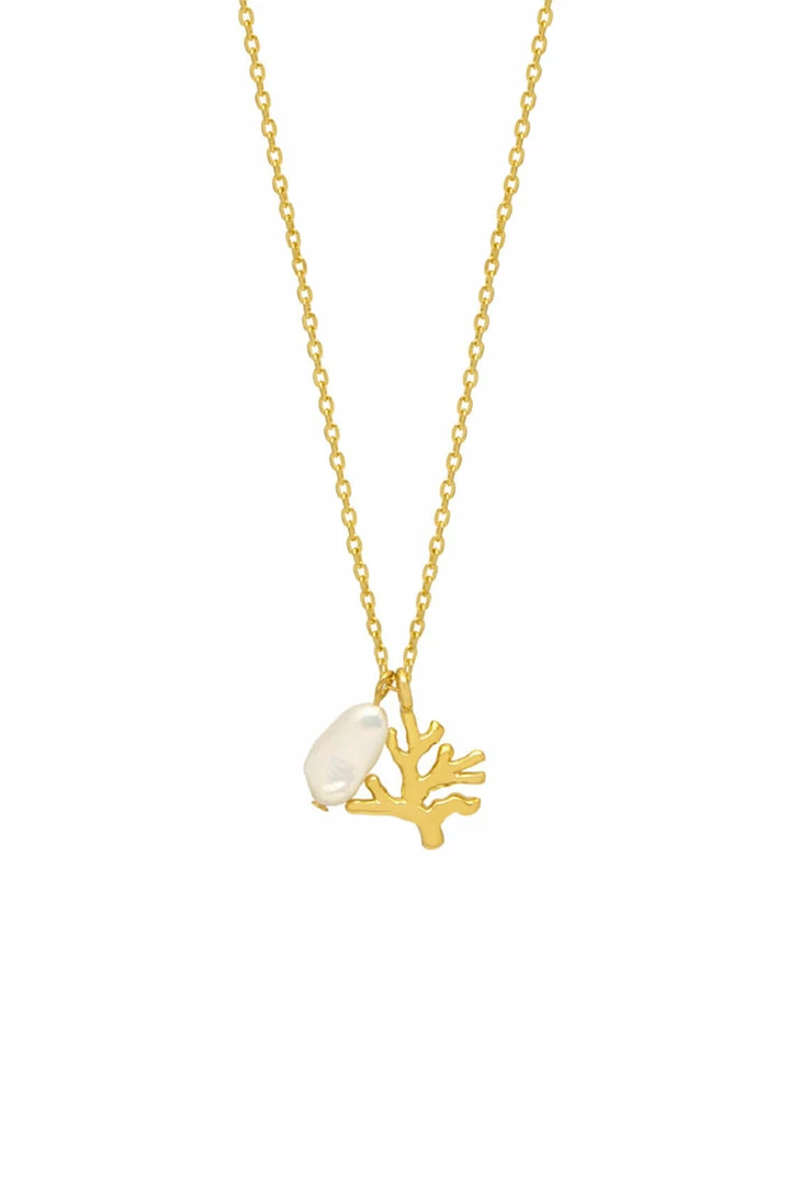 This luxurious Pearl and Coral Pendant Necklace pairs two of nature’s most stunning beauties. Featuring a delicate gold plated coral pendant paired with a natural pearl charm, this necklace exudes elegance and is perfect styled solo or layered with minimalist gold chains.