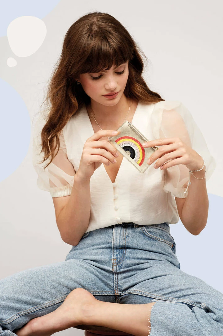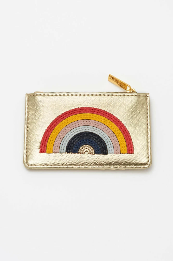 Colourful vibes abound with this beautifully appliqued card purse. The gold purse is enhanced by applique in rainbow tones, allowing you to carry all of your essentials together in style.