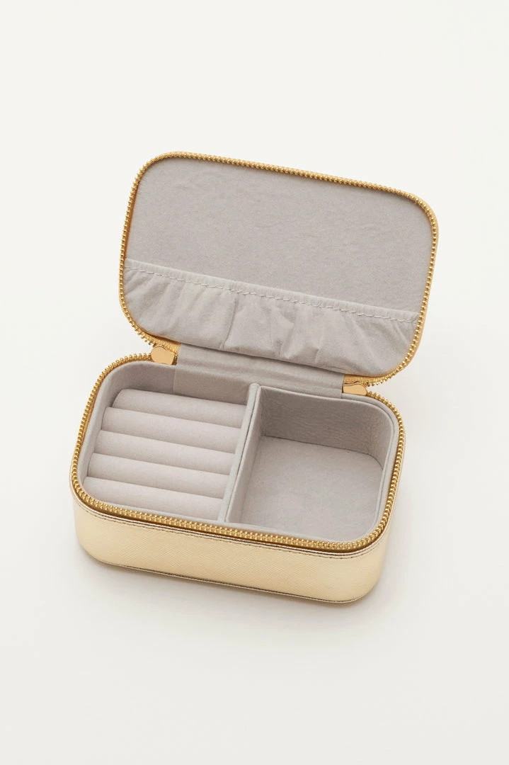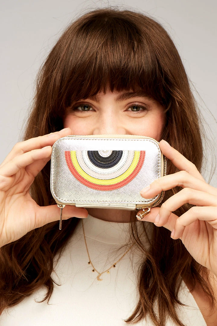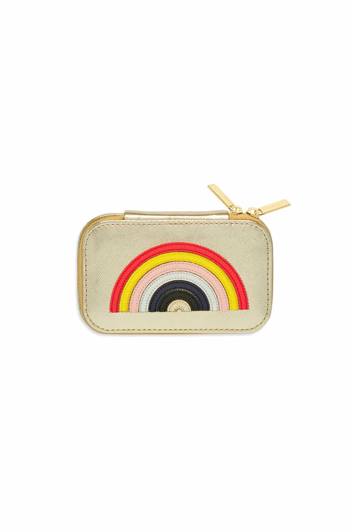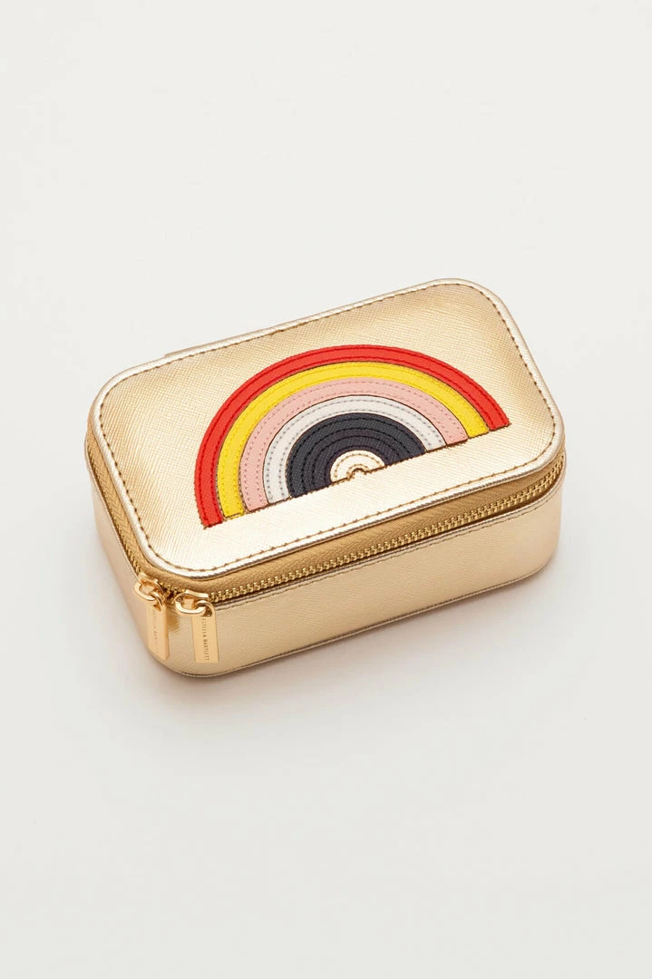 Keep all of your treasures safe with our mini jewellery box. With compartments for earrings, bracelets and necklaces. Finished in a gold vegan leather with bold applique in rainbow colours, this mini jewellery box is the perfect way to keep everything organised when you’re on the go.