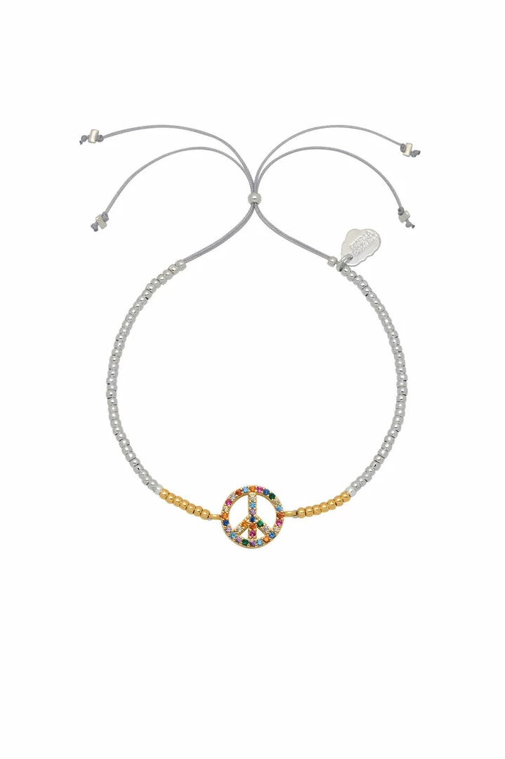 Our latest Louise Bracelet features a rainbow CZ peace sign, the perfect addition to our rainbow collection. This modern take on the friendship bracelet displays silver plated beads on a grey cord. This is a great piece to layer with other bracelets in silver or gold, and looks just perfect alongside our Rainbow Peace Symbol Necklace.