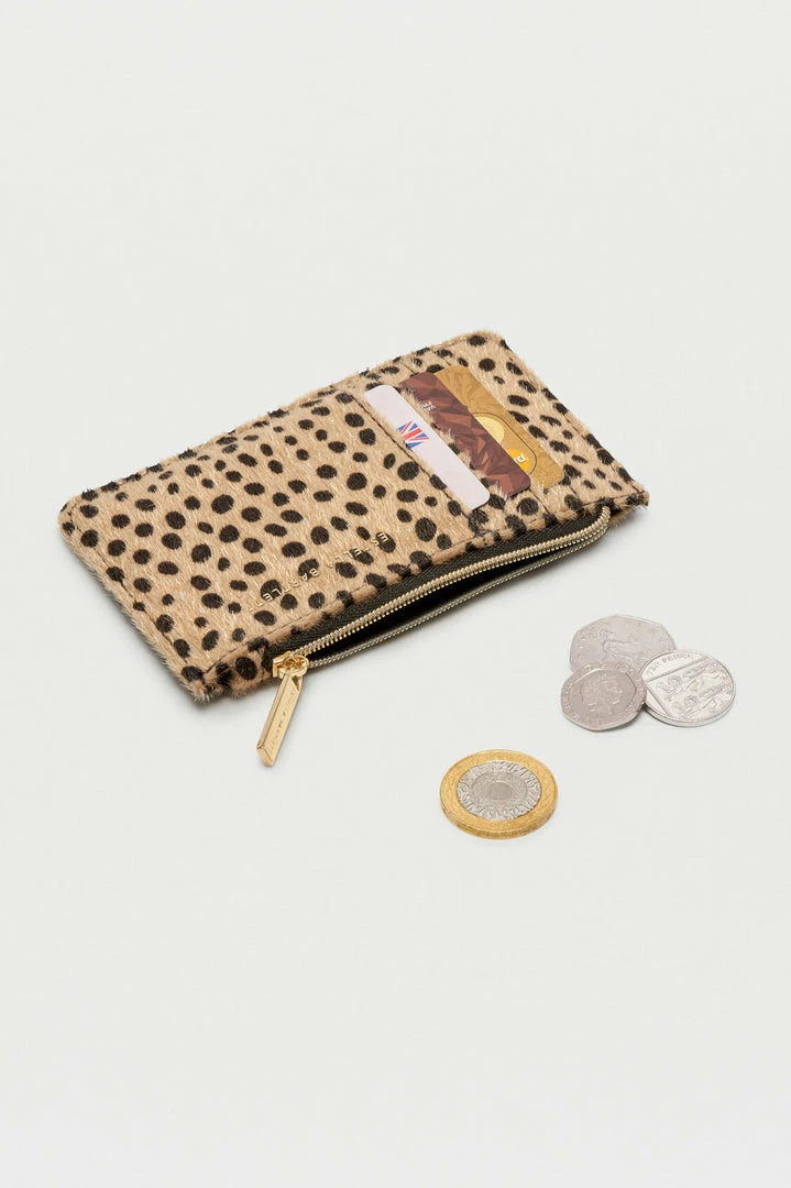 Finished in textured cheetah print, this pretty and practical card purse is the ideal accessory for carrying all your essentials together in style.
