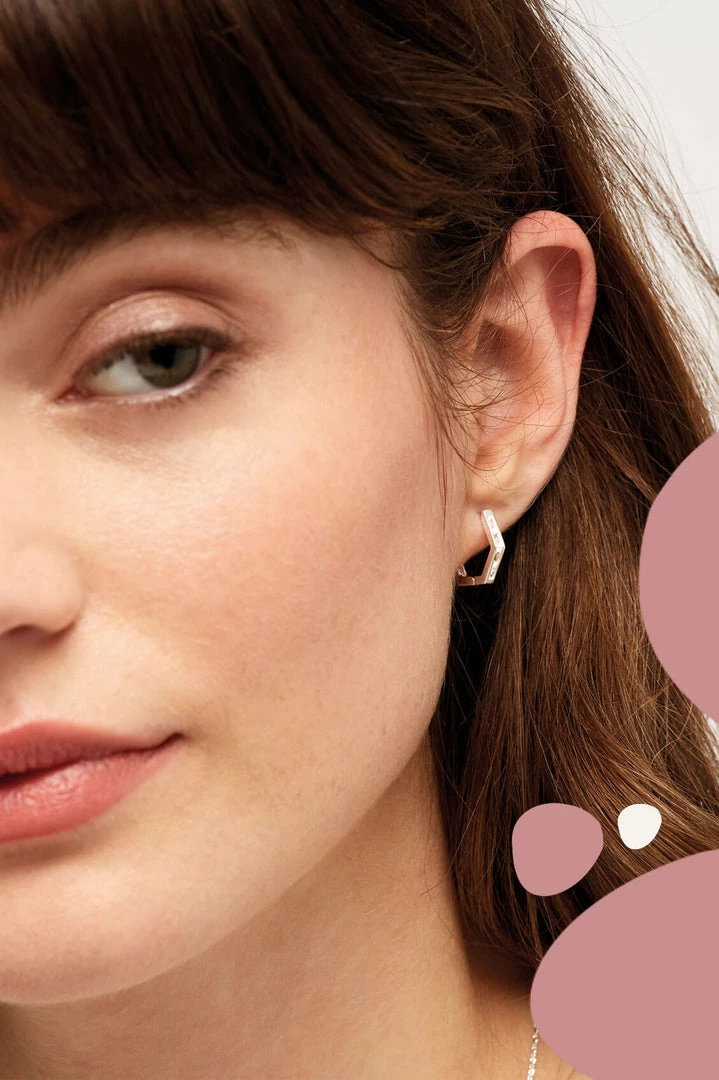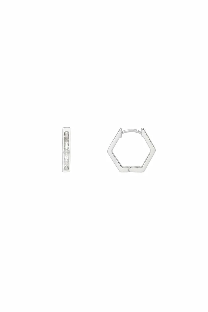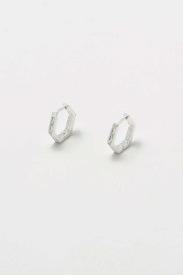 These Hexagon huggie Earrings are a modern twist on our classic CZ Hoops. The faceted geometric style is minimalist and beautiful, making these silver plated hoops perfect on their own or in a stack..