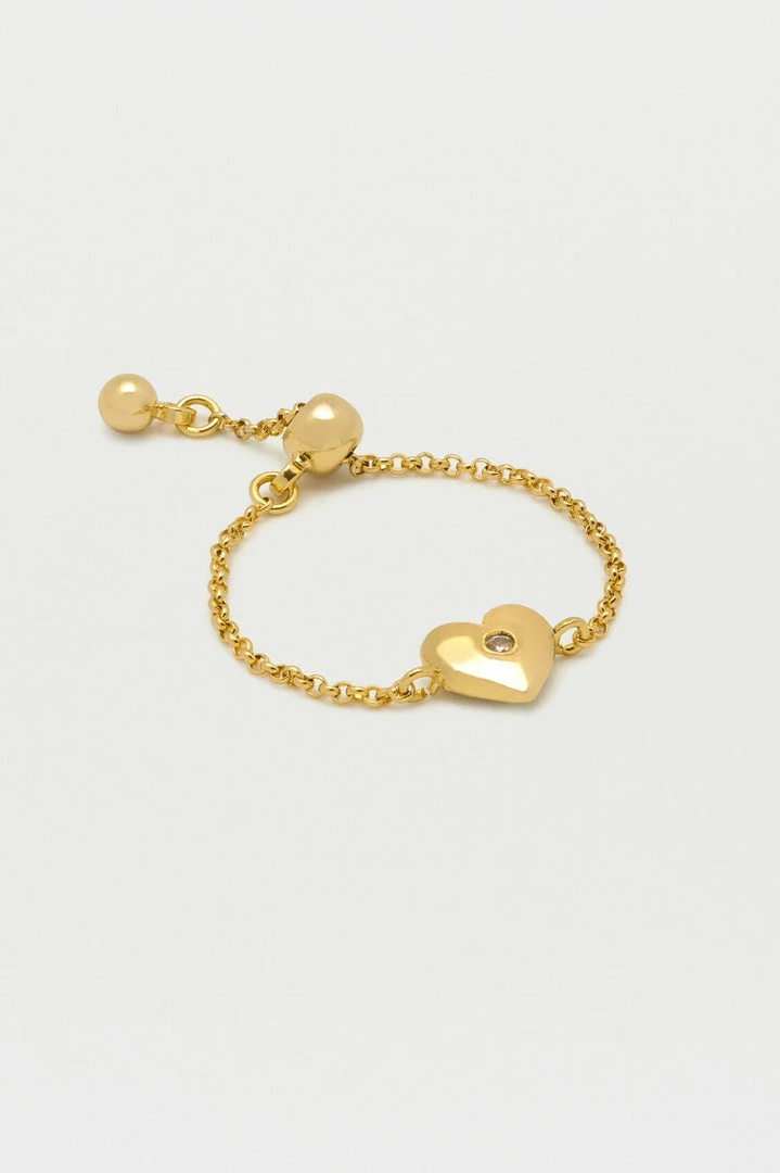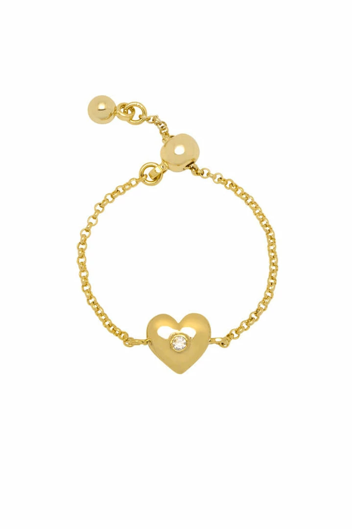 Elevate your ring stack with this Mini Heart CZ Adjustable Chain Ring. Adorned with a sparkling gold plated heart charm and featuring an easily adjustable chain so that it can be worn on any finger.