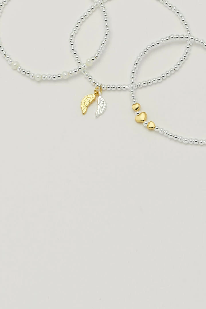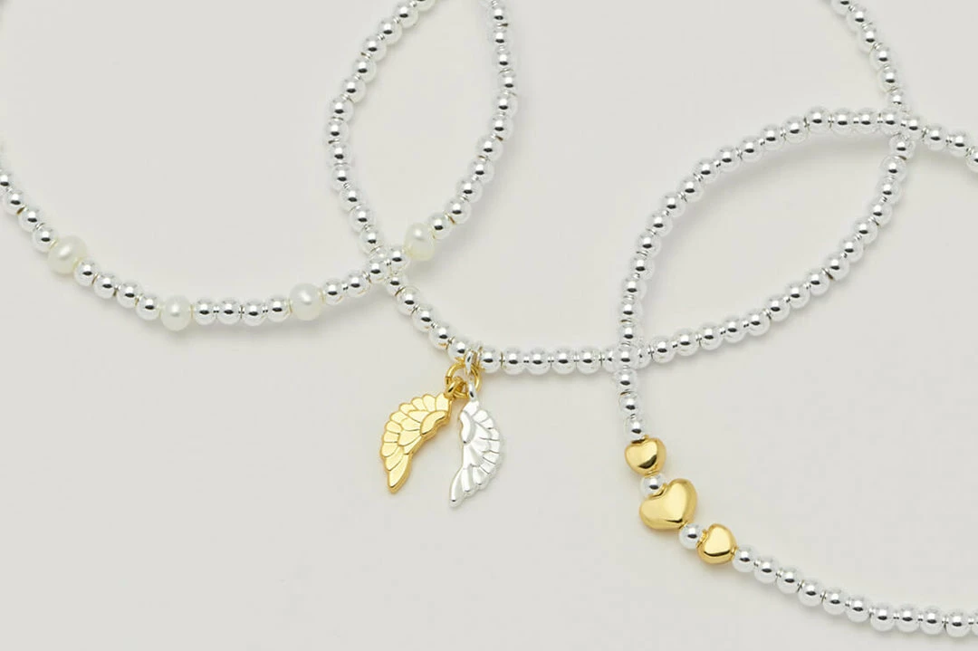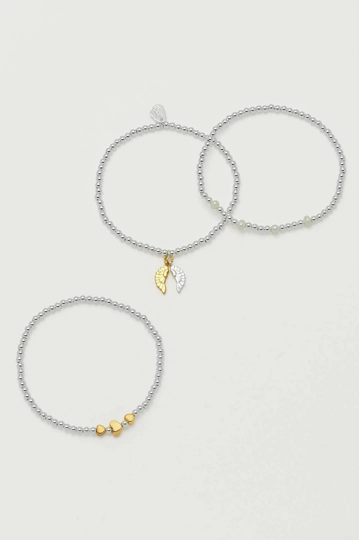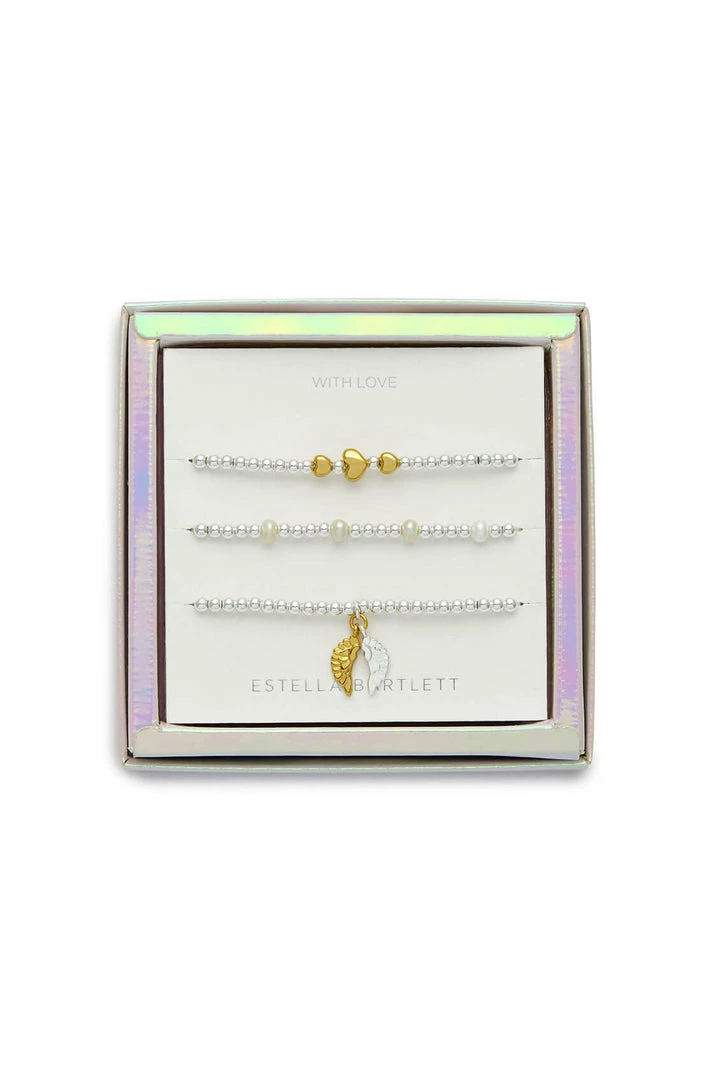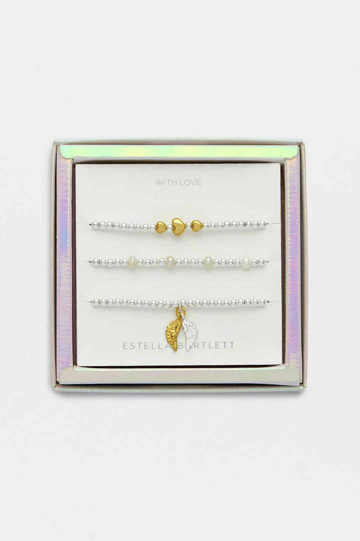 Perfect for gifting, this Estella Bartlett bracelet trio set makes an ideal gift for someone you love. This stunning gift set features our classic two tone wing charm on a silver plated bracelet with two other complimentary silver and gold plated beaded bracelets. Finished with the simple sentiment ‘With Love,’ treat a loved one, or yourself, to this charming gift set.