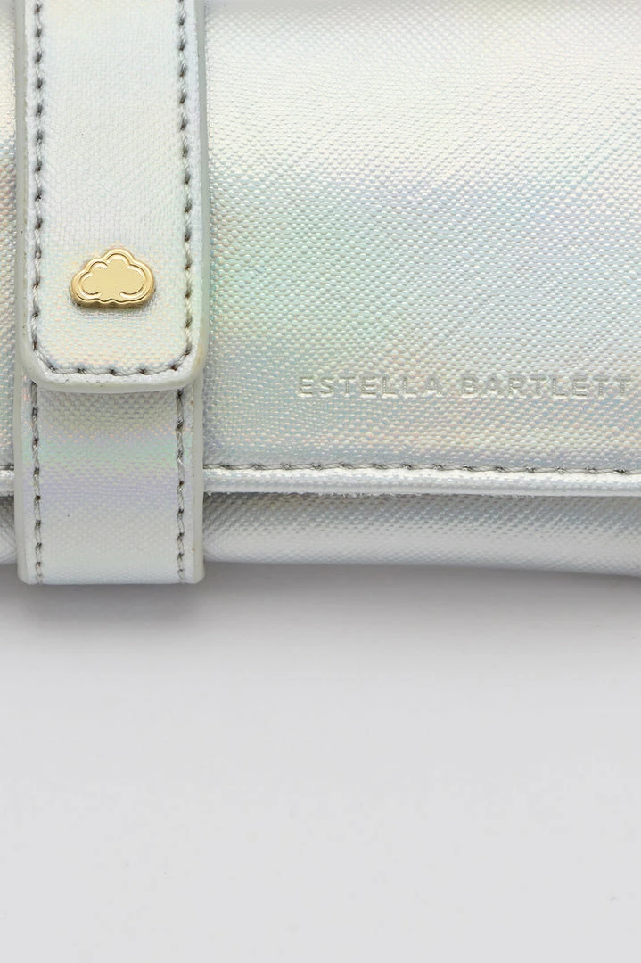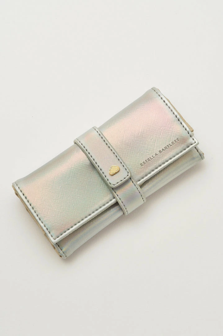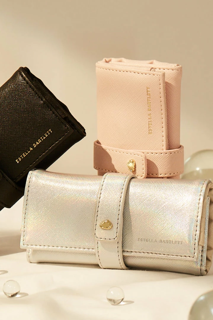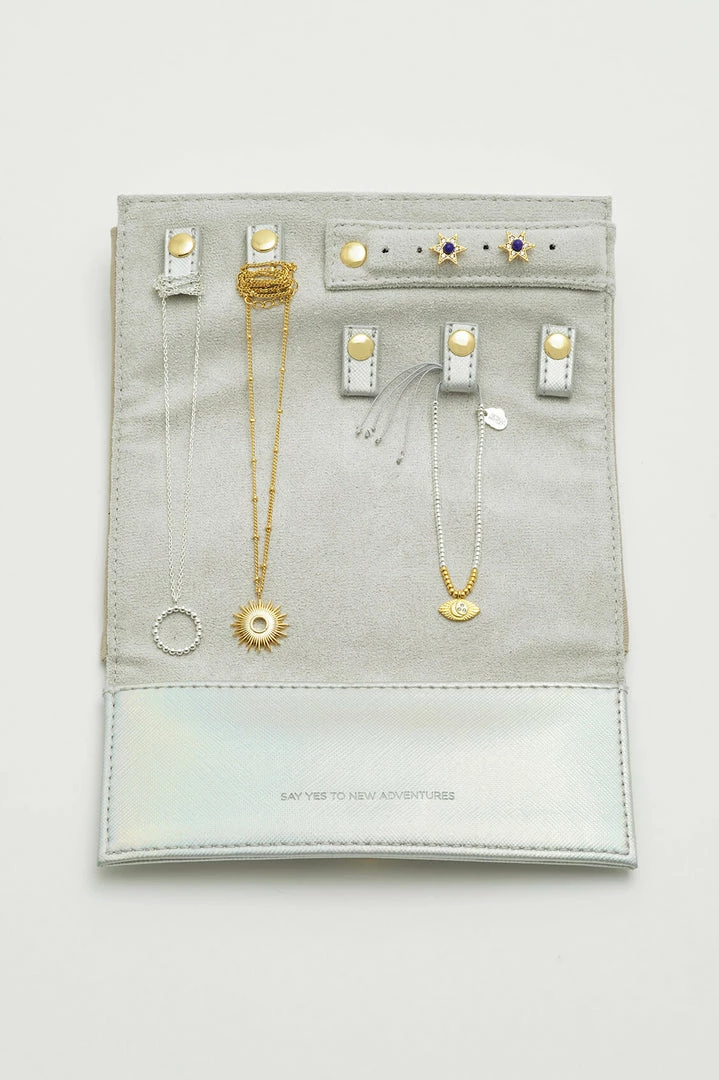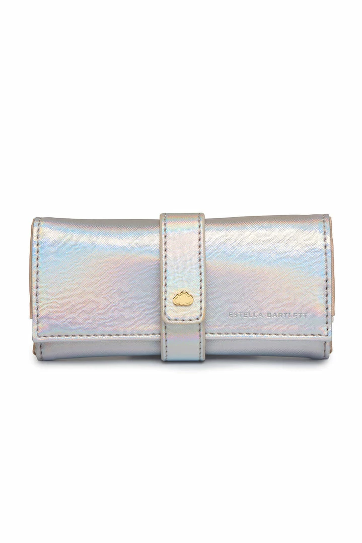 This iridescent leather look jewellery roll includes earring, necklace and bracelet holders and a pouch pocket, making it ideal for carrying all your favourite pieces.