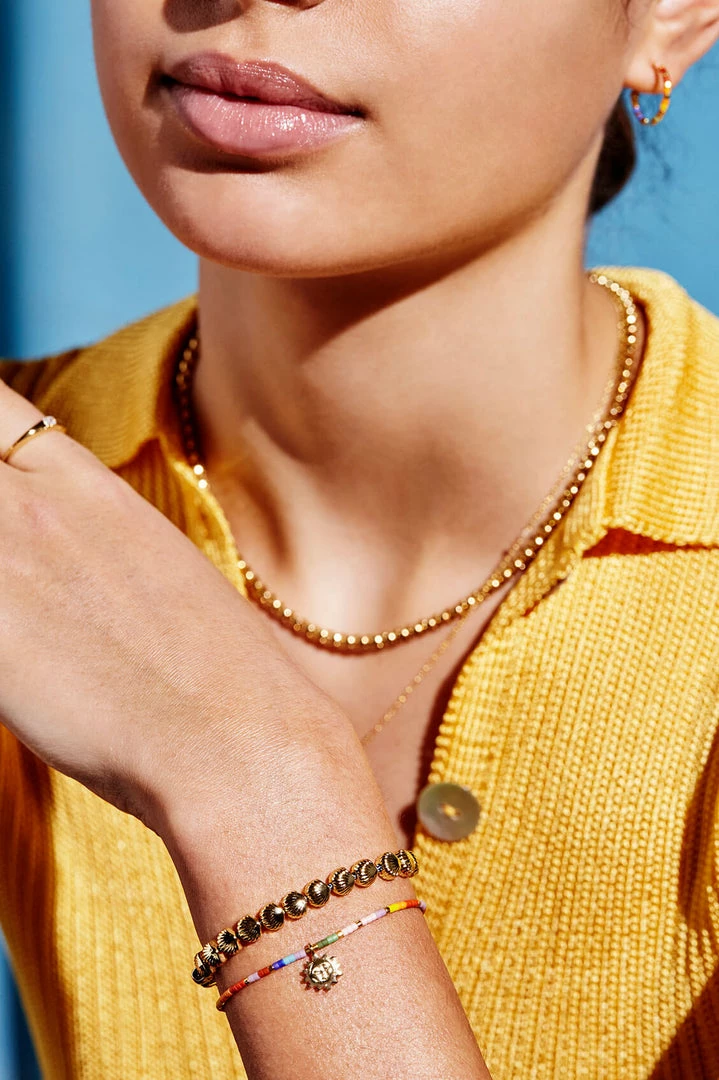 The perfect summer accessory, this Seashore Friendship Bracelet is adorned with delicate golden shells so that you can carry a bit of the seaside with you wherever you go.