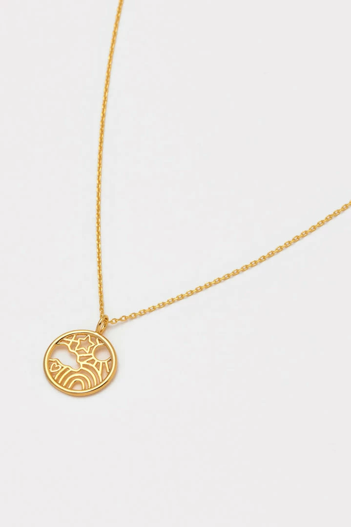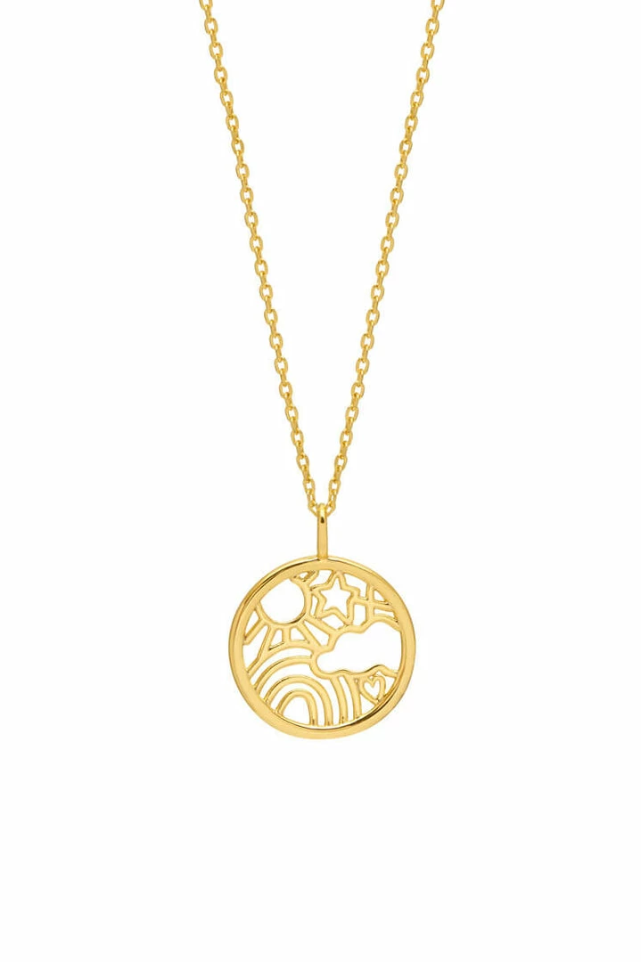 Our Sunny Days Cutout Disc Pendant Necklace is the perfect addition to your growing EB collection. The gold plated pendant is an instant mood booster with its perfect summer days image of a rainbow, sun, star and clouds. This piece can be worn alone or layered minimally with our Chunky Twisted Rope Chain Necklace.