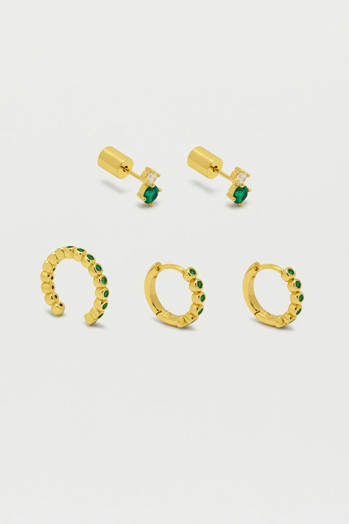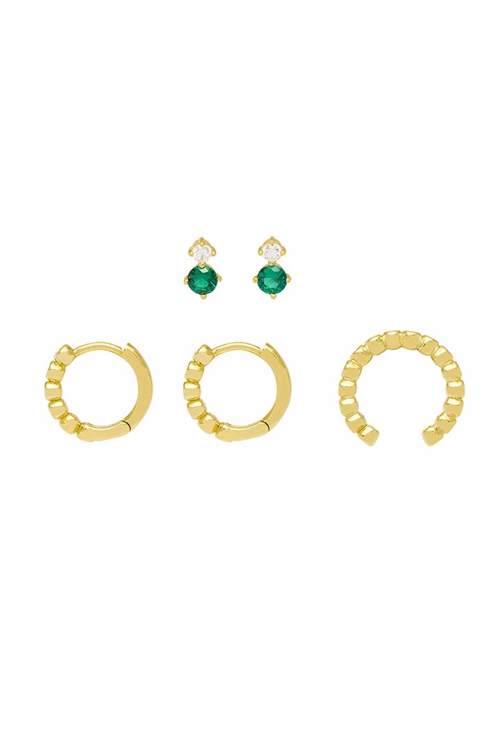Ear stacking has just gotten easier with our Trio Earring Set. The set includes the EB favourite Gold Plated Mini Beaded Huggies, Ear Cuff and sparkling White Gemstone Stud Earrings.