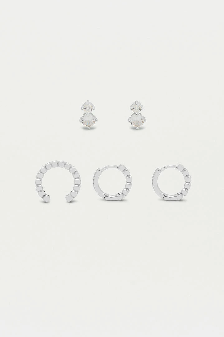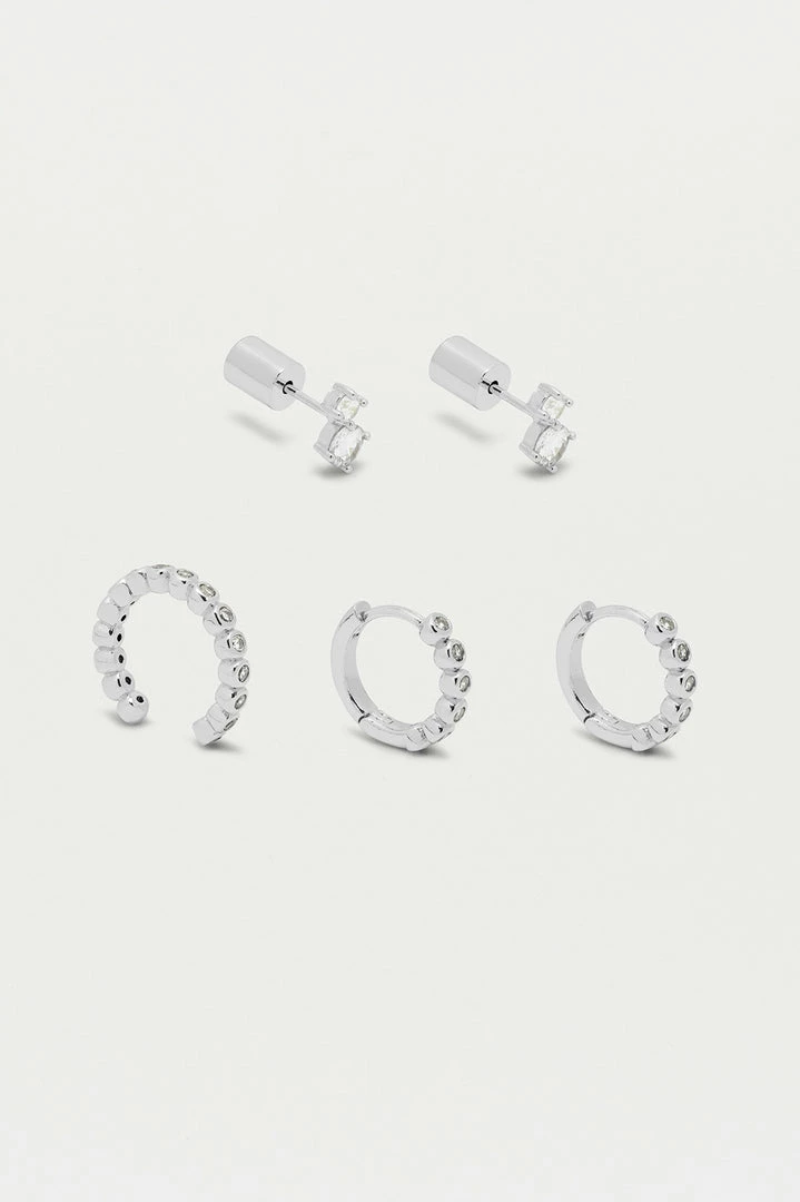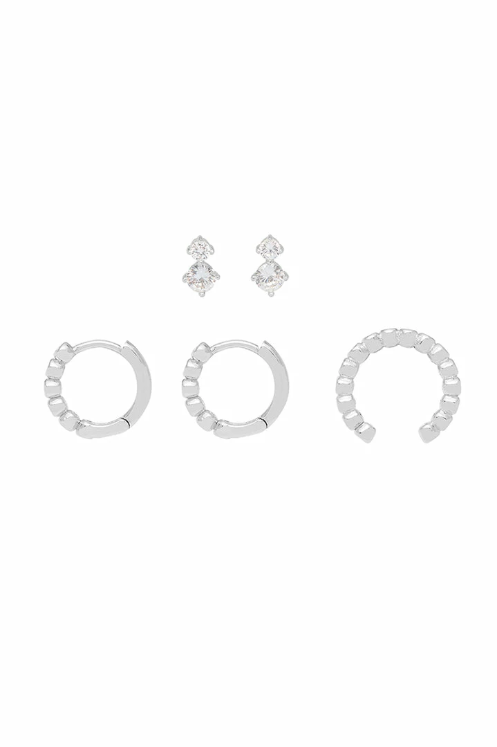 Ear stacking has just gotten easier with our Trio Earring Set. The set includes the EB favourite Silver Plated Mini Beaded Huggies, Ear Cuff and sparkling White Gemstone Stud Earrings.
