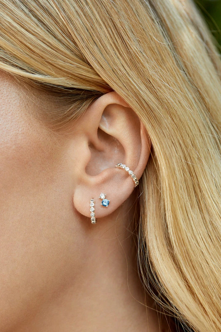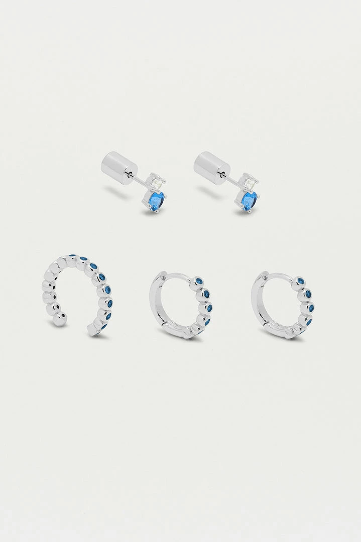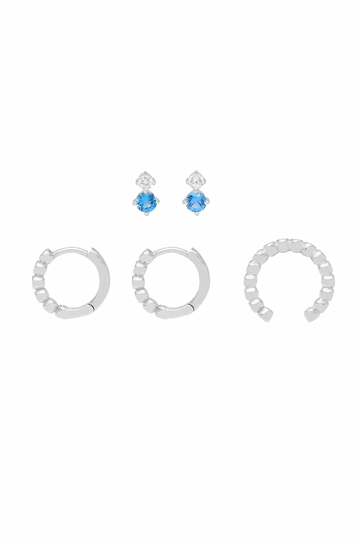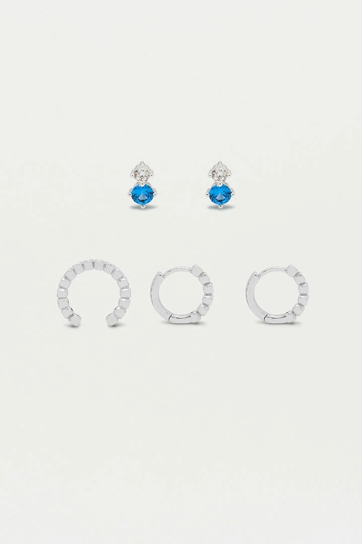 Ear stacking has just gotten easier with our Trio Earring Set. The set includes the EB favourite Silver Plated Mini Beaded Huggies, Ear Cuff and bright Blue Gemstone Stud Earrings.