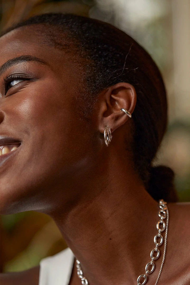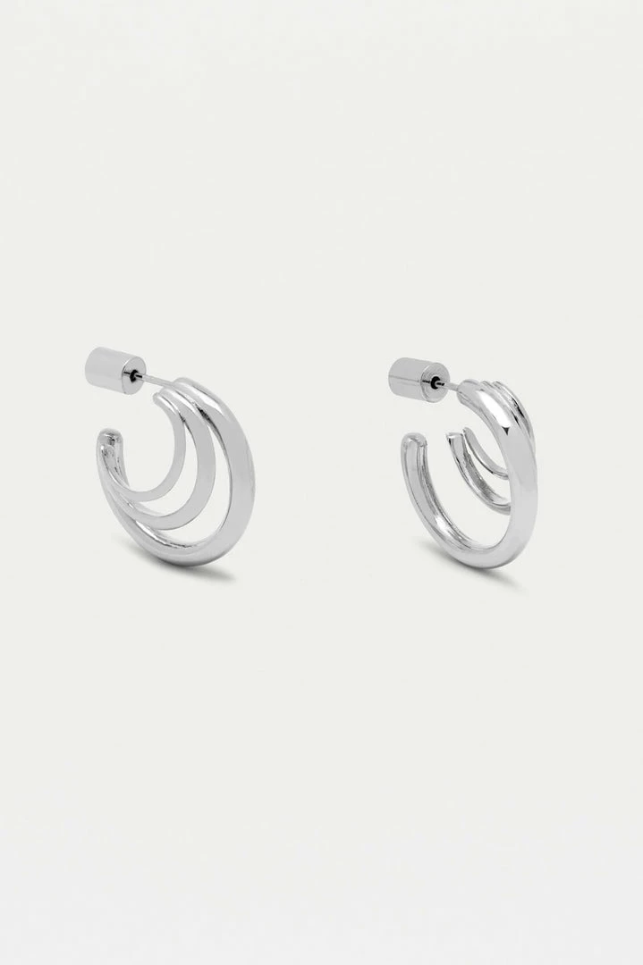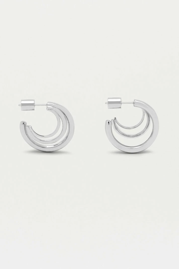Three hoops in one- and no extra piercings needed! Transform your look in just one simple step with these Triple Hoop Illusion Earrings featuring a statement tier of silver plated hoops.