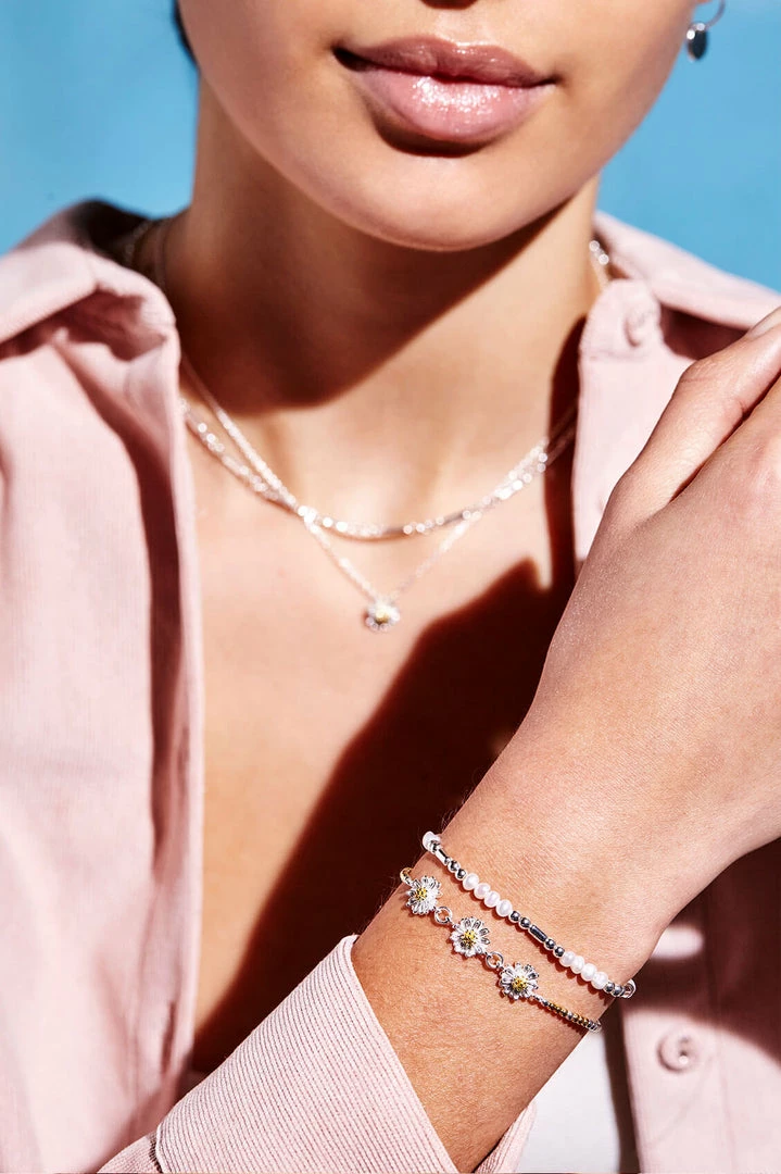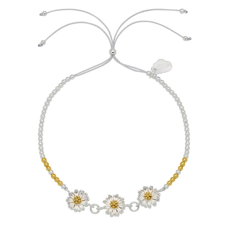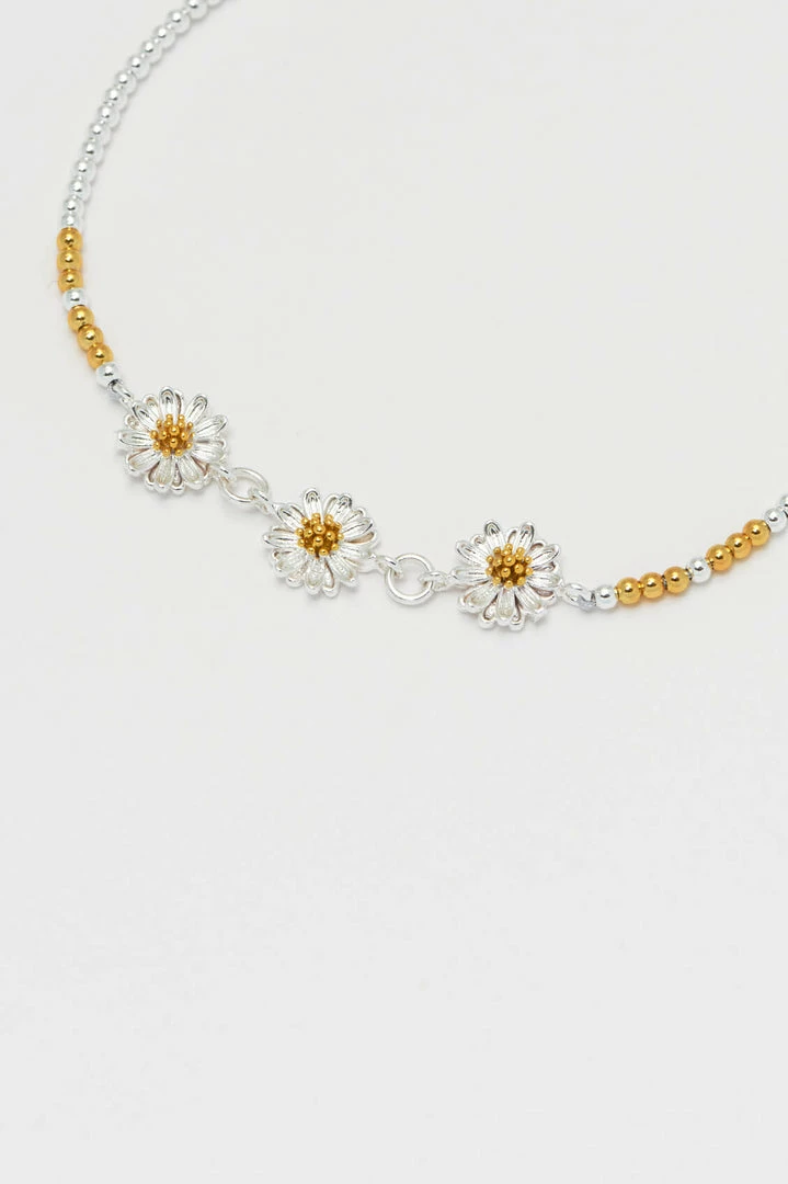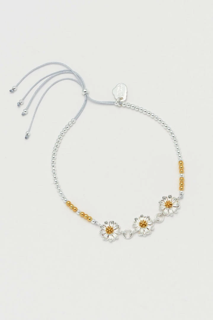 The perfect summer accessory, this Daisy Chain Louise Bracelet features a trio of delicate wildflower pendants framed by shimmering silver and gold beads. This classic, minimalist piece adds the perfect finishing touch to any outfit.