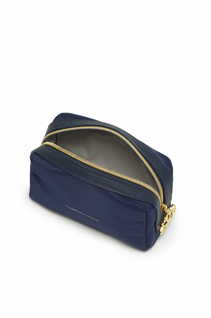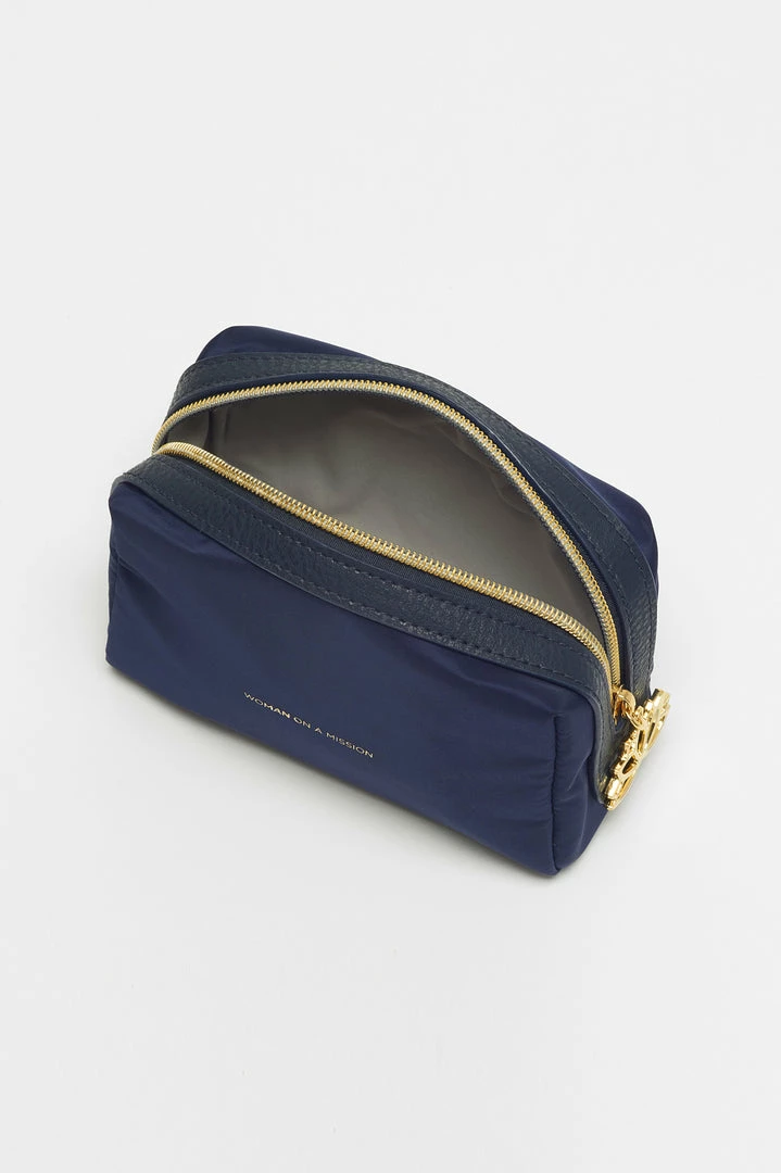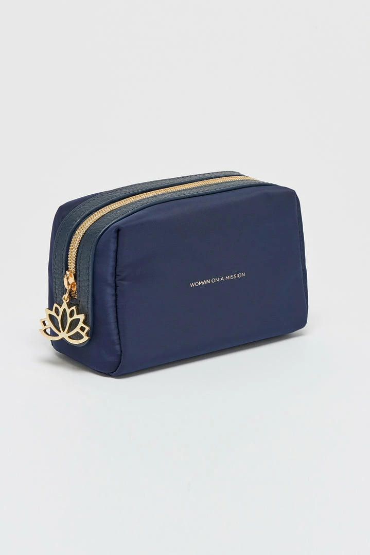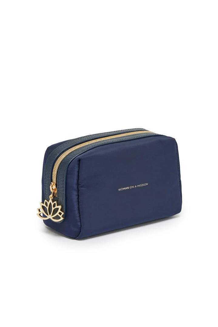 This navy blue makeup bag is the answer to all your storage solutions. Featuring a golden star zip and the inscription ‘Woman on a Mission’.