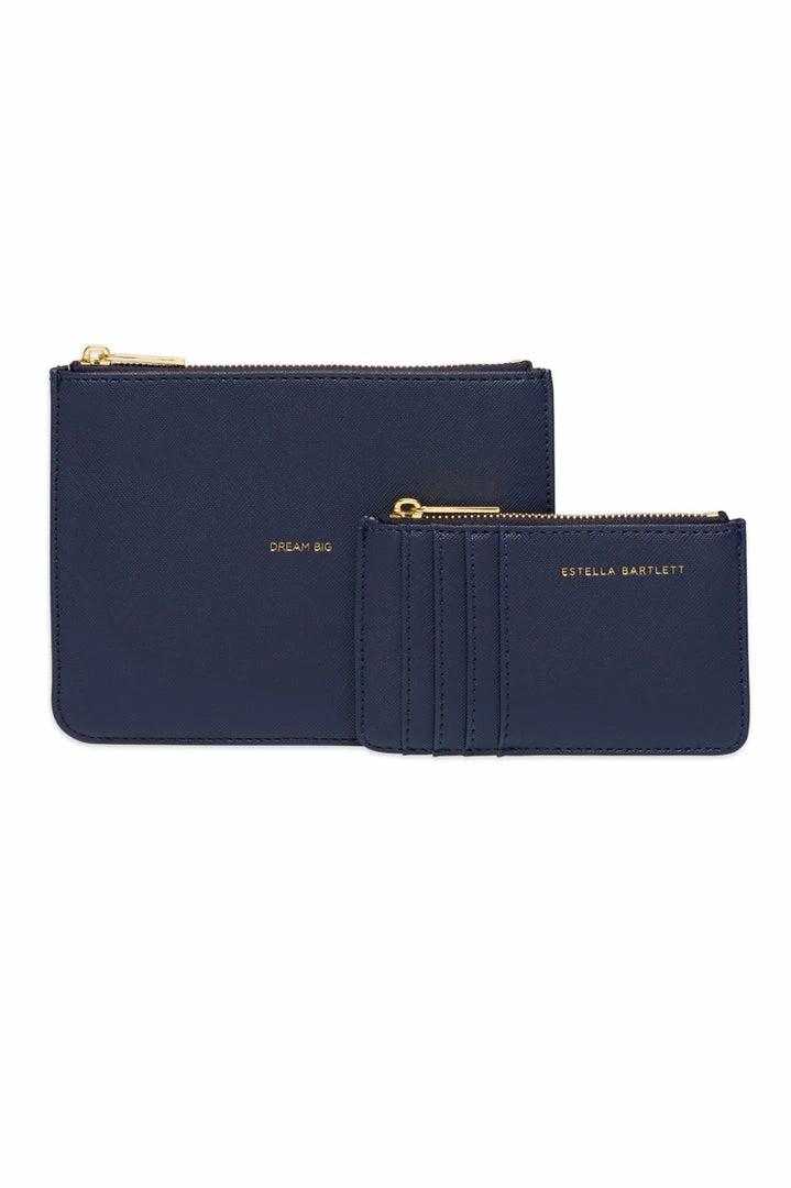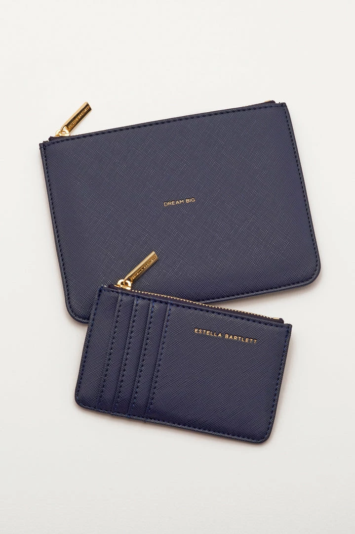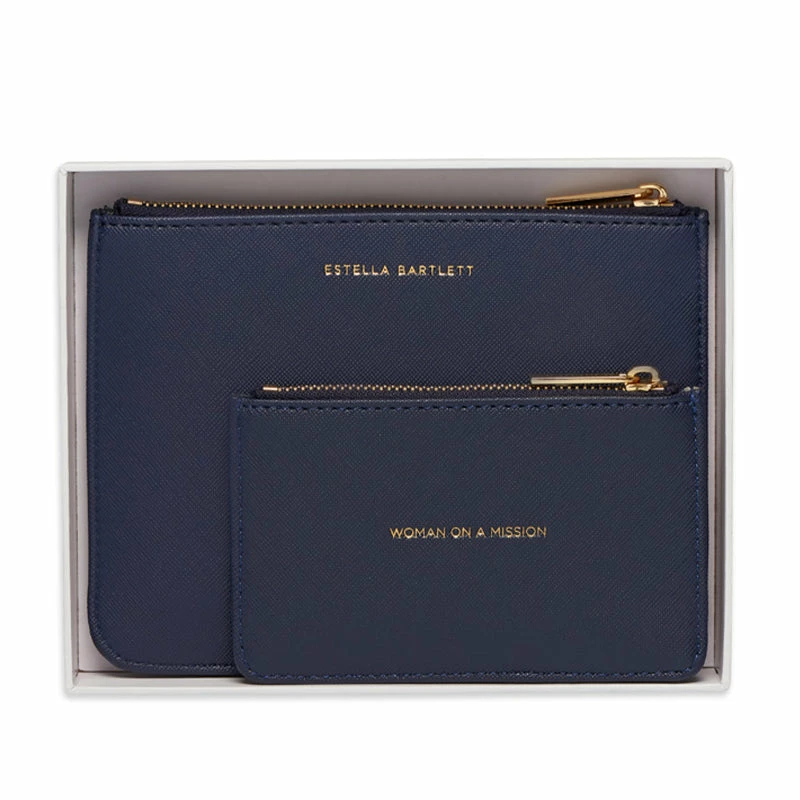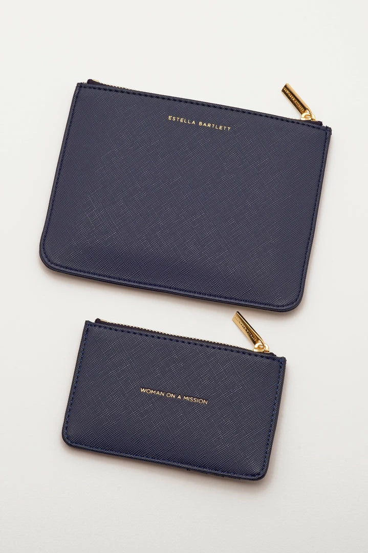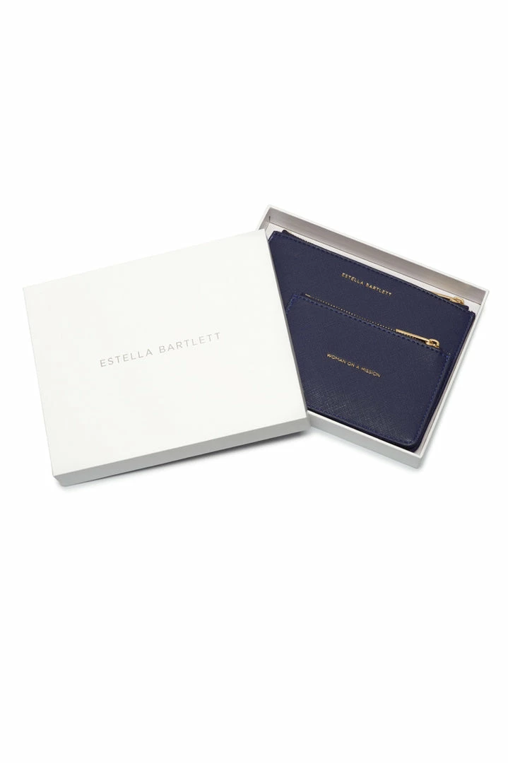 Featuring the classic designs of the Estella Bartlett small pouch and card purse, this exclusive gift set is embedded with our iconic ‘Woman On A Mission’ message finished in a sophisticated navy.