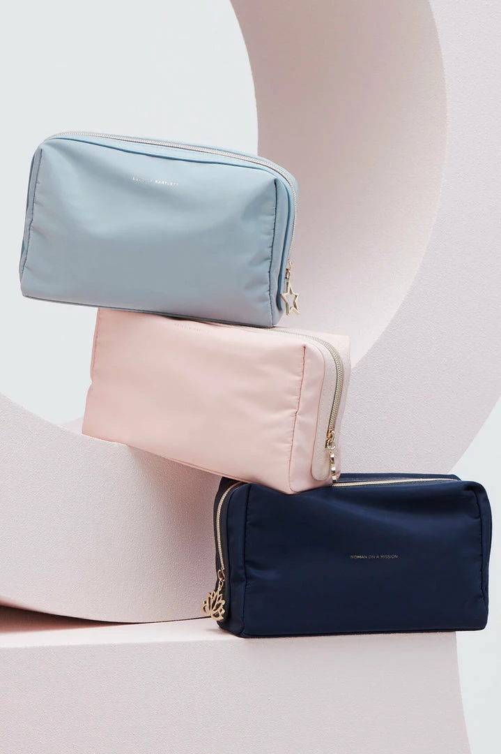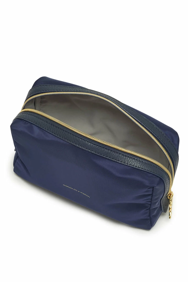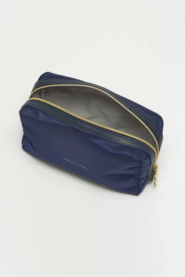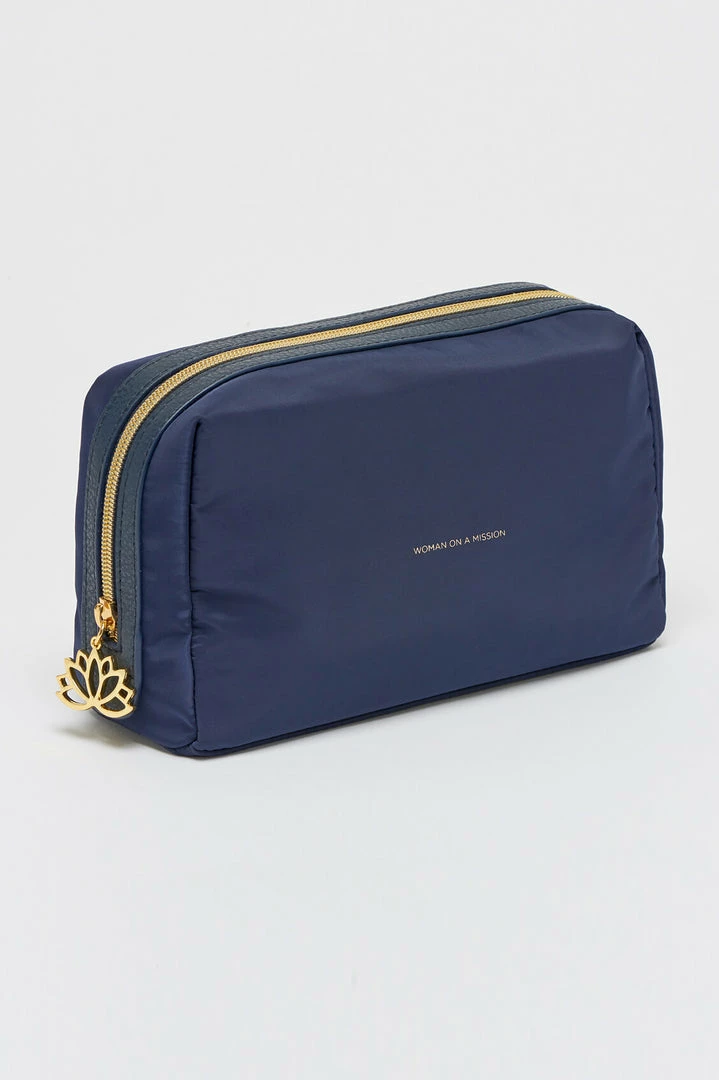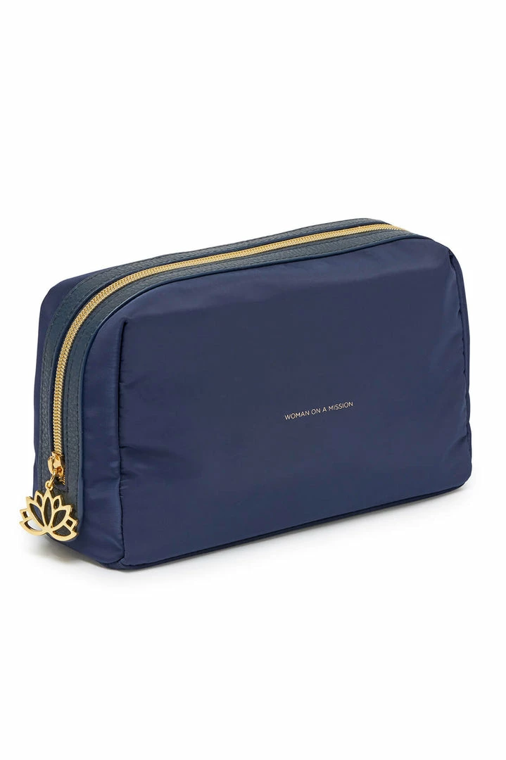 Ideal for travelling with toiletries, this pouch is both practical and stylish, and big enough for all your toiletry necessities. In a navy blue, this pouch is inscribed with the message ‘Woman on a Mission’.