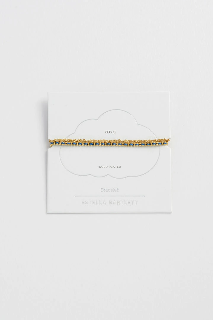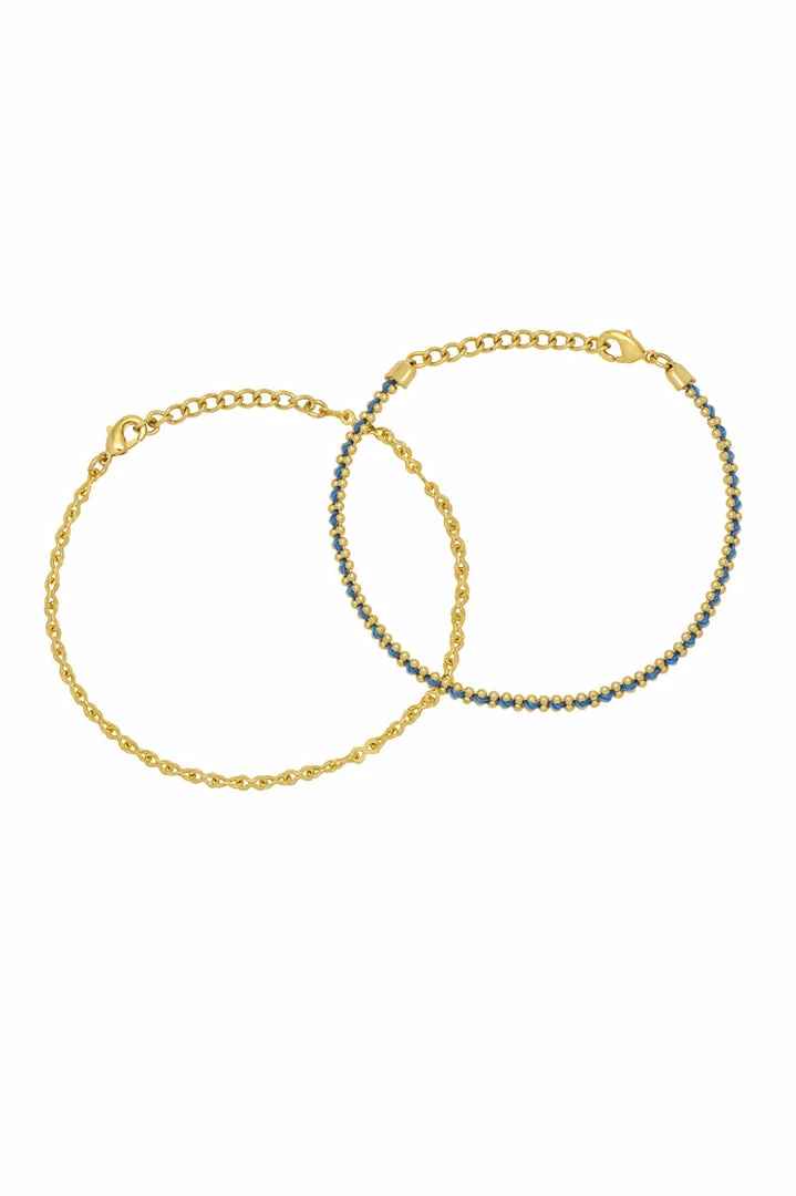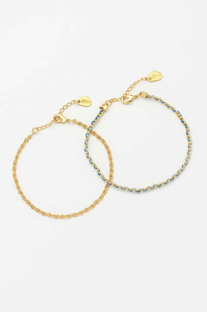 We have created a set of bracelets featuring elements of our bestselling pieces. A classic gold plated chain and woven blue thread is a combination we wholeheartedly love. Layer with other classic EB pieces for a chic look.